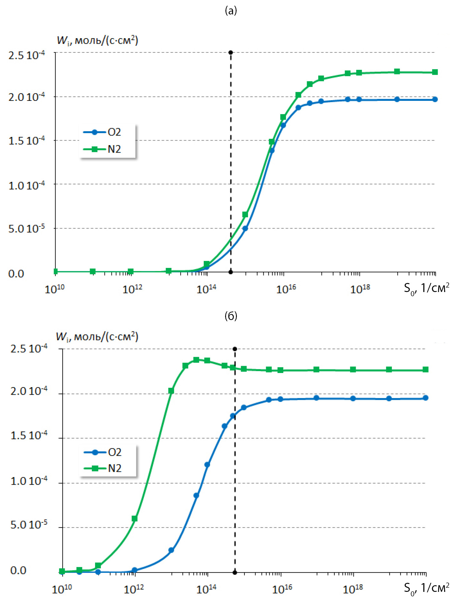 Приведенные значения газофазных концентраций для материала SiO2 еще недостаточно малы при S0 < 1019, чтобы степени заполнения начали уменьшаться. Они остаются практически постоянными во всем диапазоне изменения параметра S0. В то время как для Cu2O при значениях параметра S0 > 5 ⋅1013 степень заполнения θN резко уменьшается. При дальнейшем увеличении параметра S0 степени заполнения азотом и кислородом выходят на нулевые значения для обеих моделей.