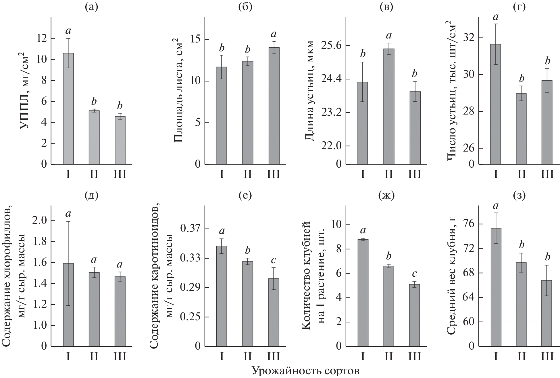 Morphological and physiological parameters of leaves and tubers of 22 varieties of potato (Solanum tuberosum) were investigated. Discriminant analysis found that stomata size (12%), chlorophyll content (10%), number of tubers (29%), and average tuber weight (21%) determined the gradation of plants by yield. The specific surface density of leaves (38%), the content of chlorophyll (13%) and carotenoids (13%), and leaf area (12%) made the greatest contribution to discrimination in relation to ecological plasticity. It is concluded that the number of stomata per unit area of the leaf, the specific surface density of the leaf and the content of photosynthetic pigments are the key characteristics that contribute to both high yield and adaptive capacity of potatoes.