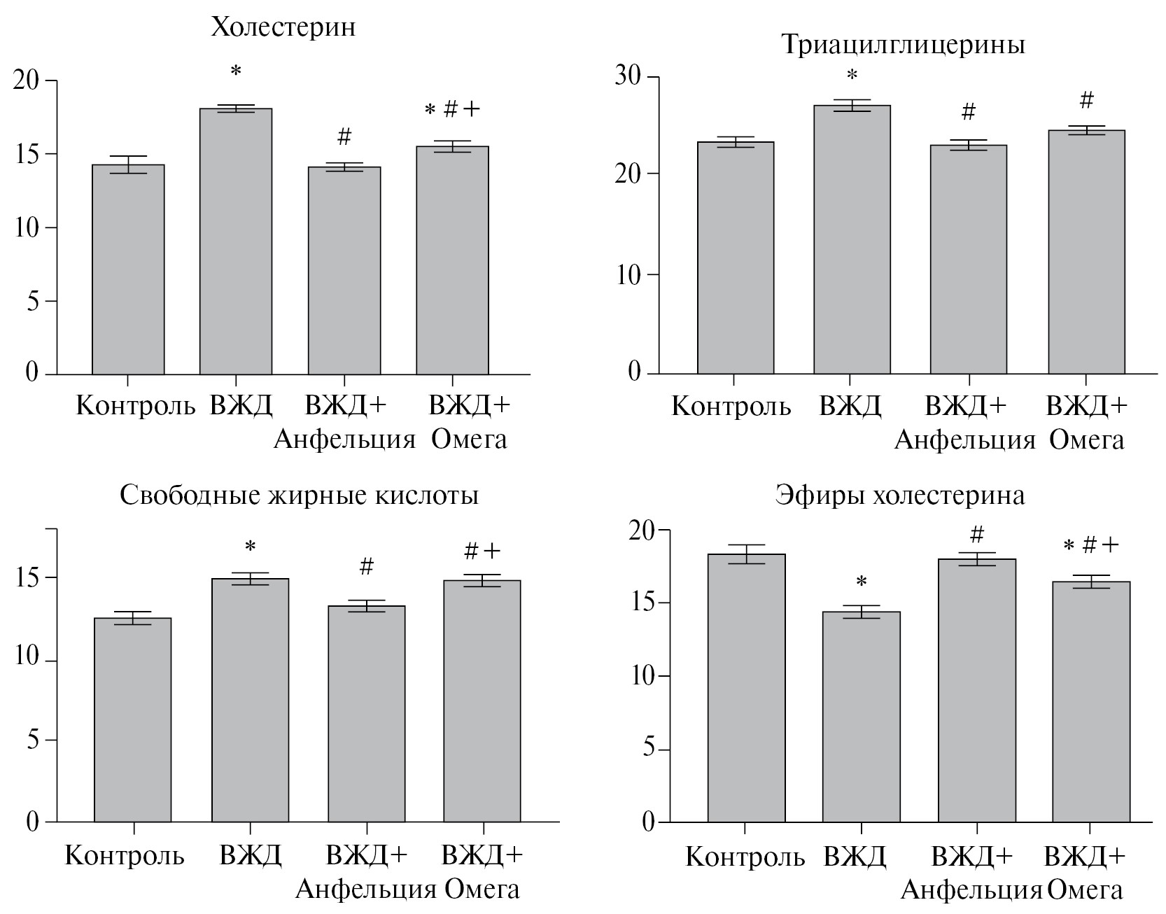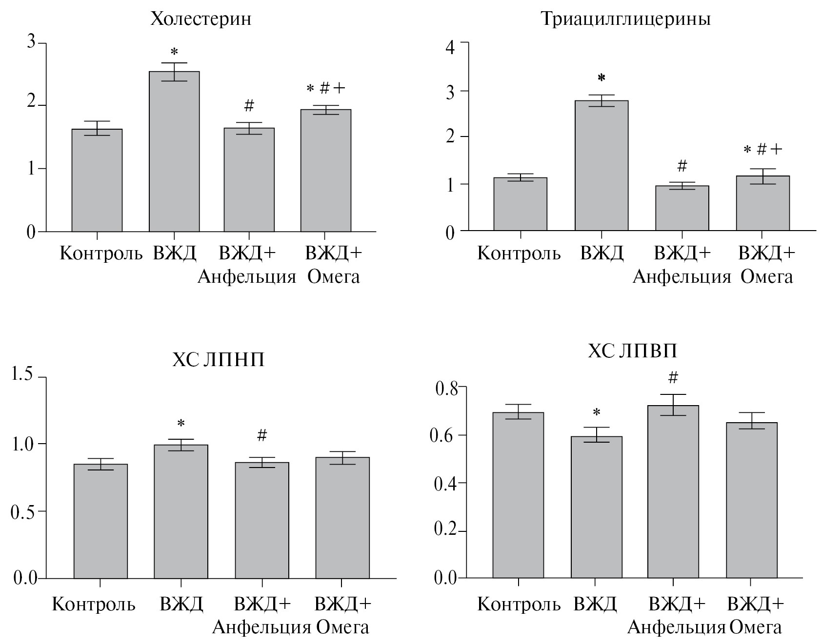 Рис. 1. Содержание фракций липидов (ммоль/л) в плазме крови крыс в условиях высокожировой диеты (ВЖД) при введении липидного комплекса из A. tobuchiensis и препарата Омега. Различия достоверны (p < 0.05) по сравнению с контролем – *, с группой ВЖД – #, с группой ВЖД + анфельция – +
