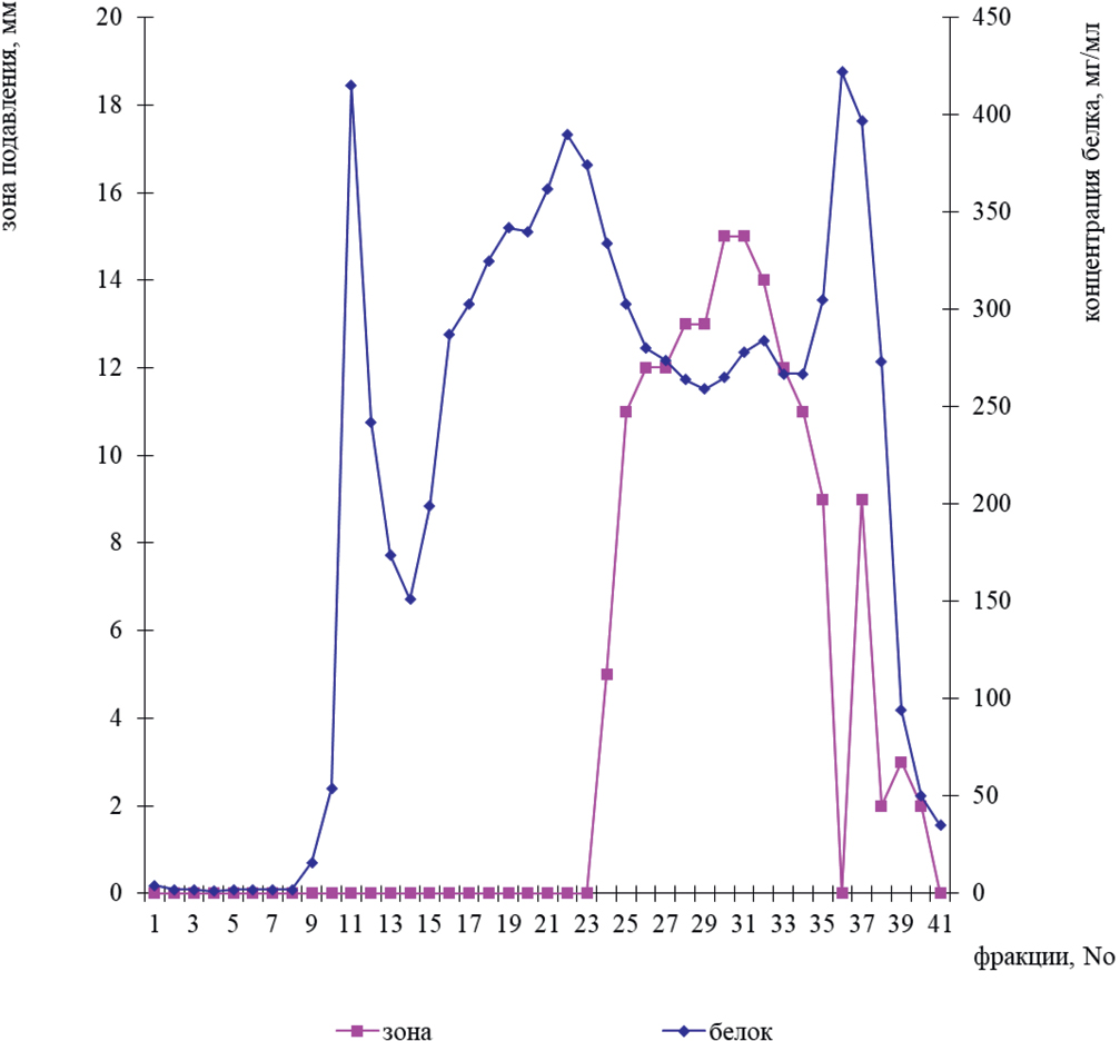 Рис. 1. Антимикробная активность белоксодержащих фракций, полученных после очистки супернатанта КЖ штамма Ent. faecium КЕ-5 методом гель-фильтрации против St. pneumonia