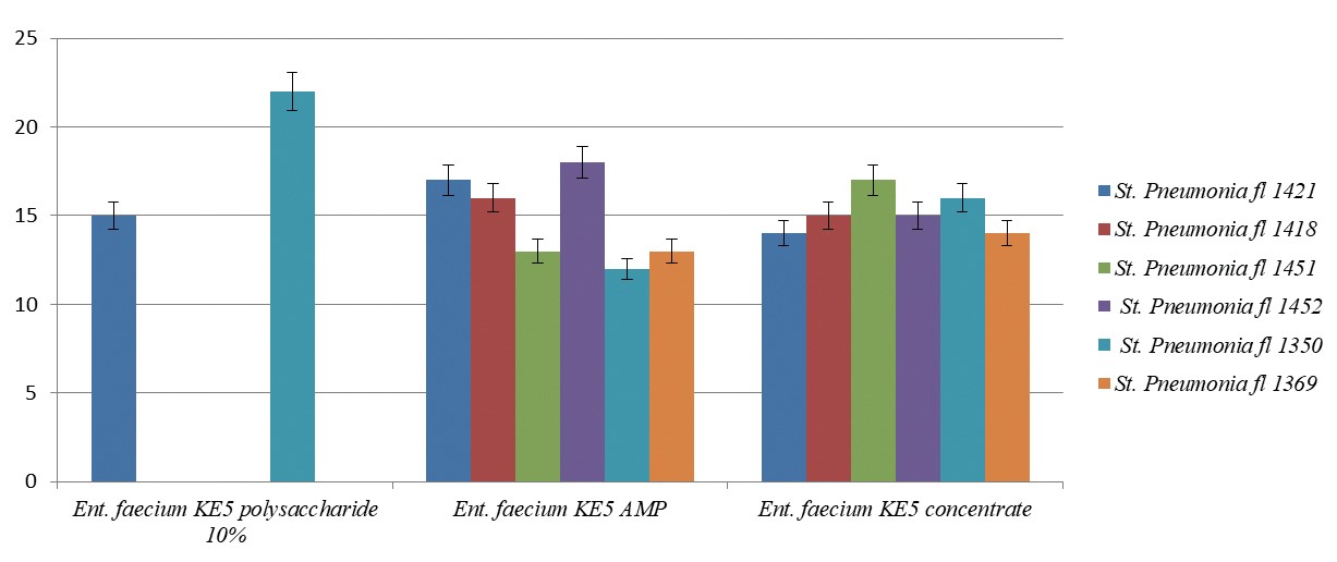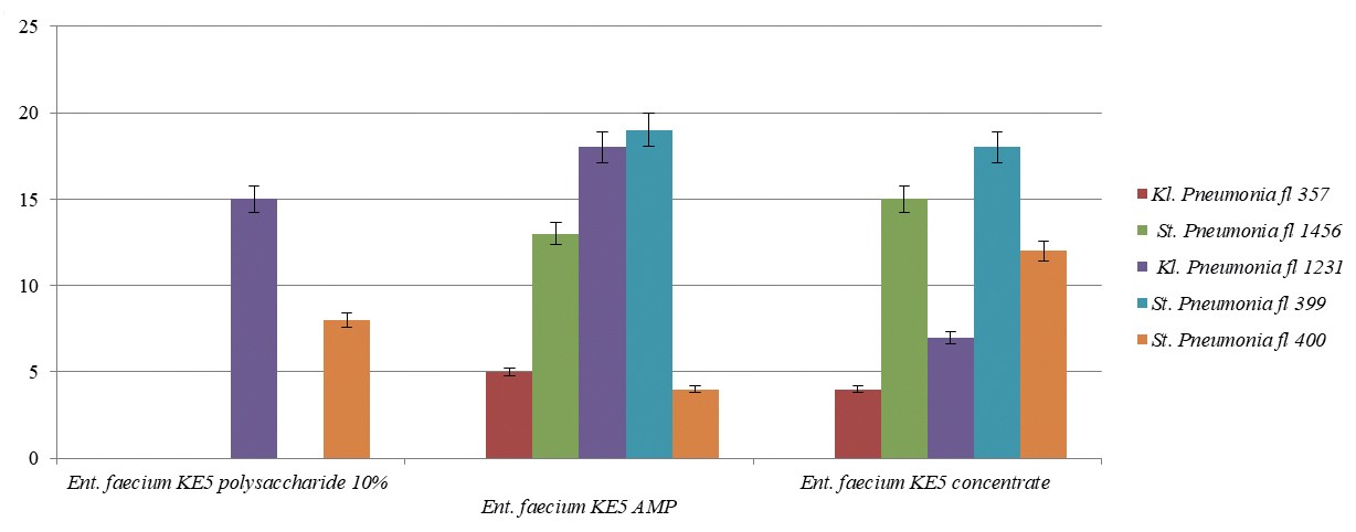 Как видно из данных (рис. 2) 10%-й водный раствор полисахаридов штамма Ent. faecium КЕ-5 ингибировал рост только двух штаммов патогенных бактерий Kl. pneumonia f1 1231 и St. pneumonia f1 400. Антимикробный препарат (АМП) и супернатант КЖ, содержащий разные метаболиты (белковоподобные фракции, полисахариды и органические кислоты), с разной эффективностью подавляют рост двух патогенных штаммов.