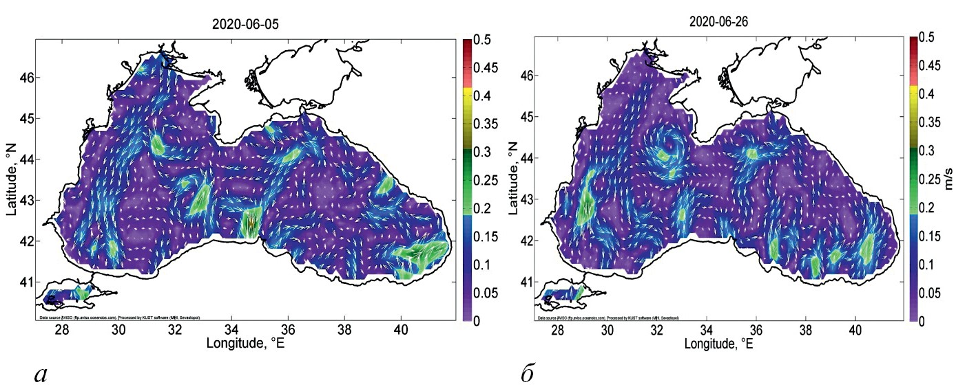 Рис. 2. Расчетные схемы геострофических течений на начало и окончание ихтиопланктонных исследований в июне 2020 г.: а – 05.06.2020; б – 26.06.2020 (Морской портал…, 2021)