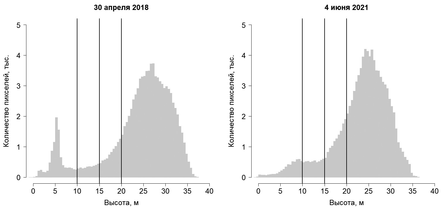 Далее полученные DEM с разрешением 30 см/пиксель обрабатывали в программе QGIS (QGIS development team, 2021) с помощью “Калькулятора растров”. Сначала нормировали высоты пикселей: из высоты каждого пикселя вычитали минимальную высоту DEM, таким образом высоты переводили из системы отсчета, связанной с уровнем моря, в локальную. Затем строили и анализировали гистограммы распределения высот для выделения пороговых значений высоты для разных классов древесной растительности (полога леса и окон разной стадии зарастания).