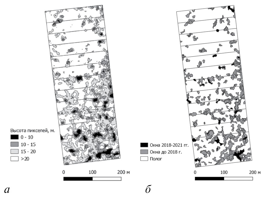 На рис. 3а представлен план постоянной пробной площади, построенный по данным аэрофотосъемки в июне 2021 г., с разделением территории на полог леса и окна возобновления разной давности, выделенных на основе выбранных пороговых значений высоты.