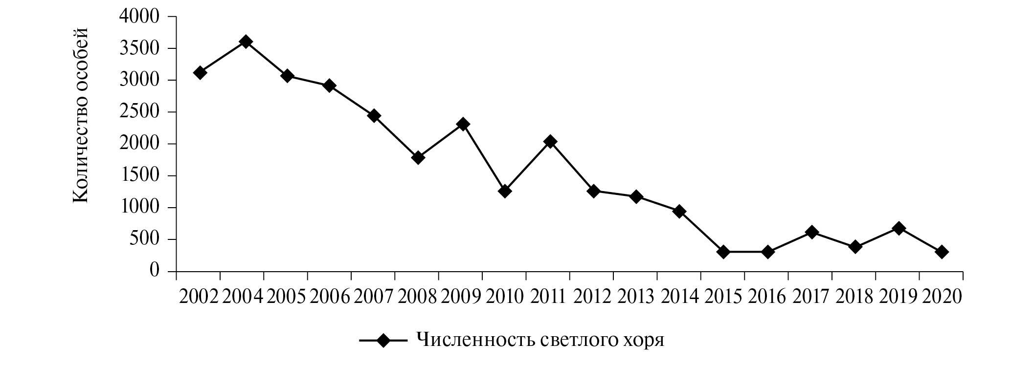 Численность светлого хоря на всей территории Челябинской области в период с 1970 по 1990 г. составляла 900–2390 особей (табл. 1) (Матвеев, Бакунин, 1994). За восемнадцать лет, с 2002 г. по 2020 г. она выросла от 3114 в 2002 г. до 3598 ос. в 2014 г. и снизилась до 300 ос. в 2020 г. (рис. 1; табл. 2) (Комплексный.., 2008; Государственный…, 2021).