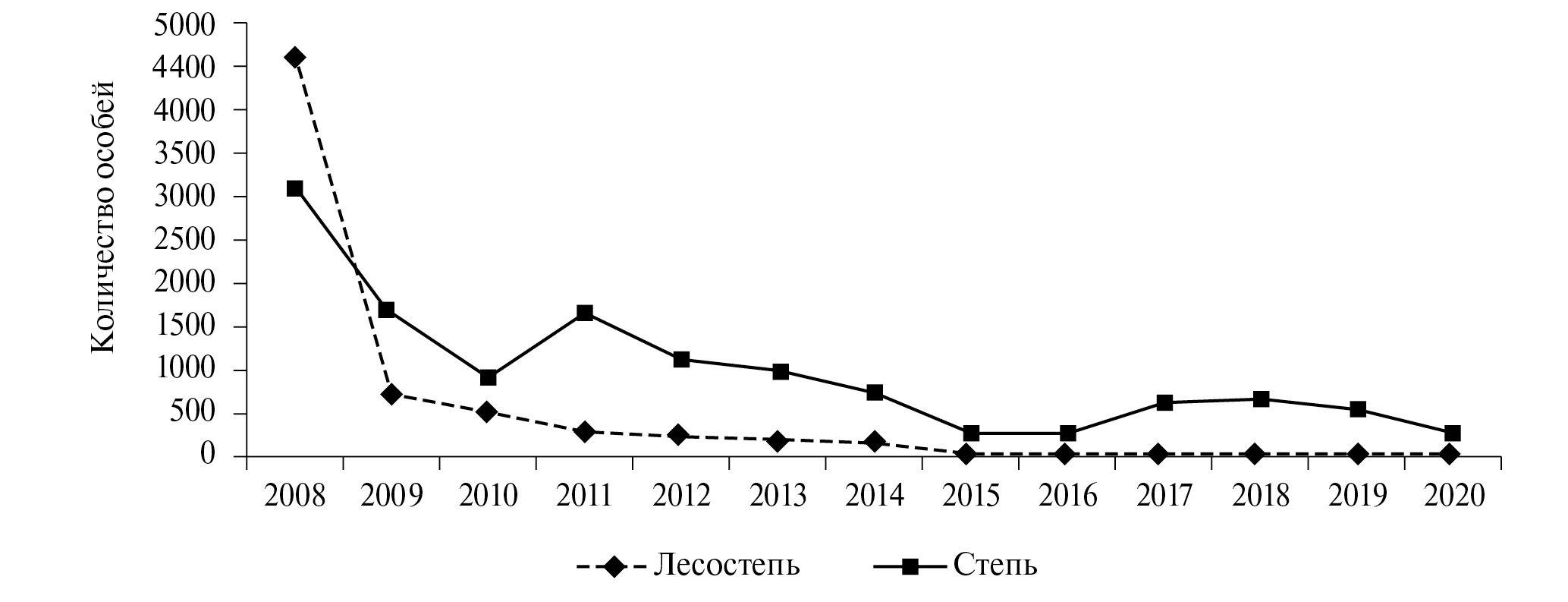 В лесостепных и степных территориях области светлый хорь в настоящее время еще встречается, но численность его за период с 2008 г. по 2020 г. также сократилась, особенно существенно в лесостепи и несколько меньше в степи (рис. 2). Например, в Троицком районе (лесостепь) в 2008 г. по данным ЗМУ насчитывалось 1230 особей, однако уже в 2014–2020 гг. не было встречено ни одного зверька. В Красноармейском районе (степь) в 2008 г. насчитывалось 2364 ос., за период с 2018 г. по 2020 г. было учтено всего от 14 до 24 ос. (Комплексный … 2008; Государственный… ., 2021). За двенадцать лет, с 2008 г. по 2020 г., численность светлого хоря в лесостепных районах снизилась почти в 90 раз, с 3058 ос. в 2008 г. до 26–34 ос. в 2019–2020 г. (рис. 2).