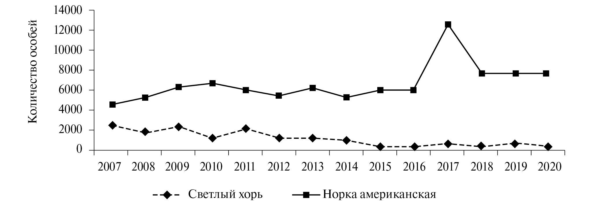 Многими исследованиями показано, что интродуцированные чужеродные виды могут негативно влиять на местных конкурентов, сокращая их популяции или устраняя их из экосистем (Sax et al., 2007). Распространение американской норки привело к полному исчезновению европейской норки (Mustela lutreola Linnaeus, 1761) на протяжении почти всего ее ареала (Sidorovich, Macdonald, 2001; Maran, 2007; Kiseleva, 2016). На территории Челябинской области европейская норка, кроме горной тайги, встречалась на северо-востоке области в лесостепной и степной зоне на реке Синара. Отдельные особи встречались до конца XX в. при этом численность светлого хоря сохранялась достаточно высокой (Матвеев, Бакунин, 1994). После проникновения в этот район американской норки и после нарастании ее численности европейская норка исчезла. Численность хоря в этом районе в 2008 г. составляла 737 ос., но уже через 9 лет – в 2017 г. численность составила – 80 ос., в 2020 г. только 51 ос. (Государственный…, 2021).