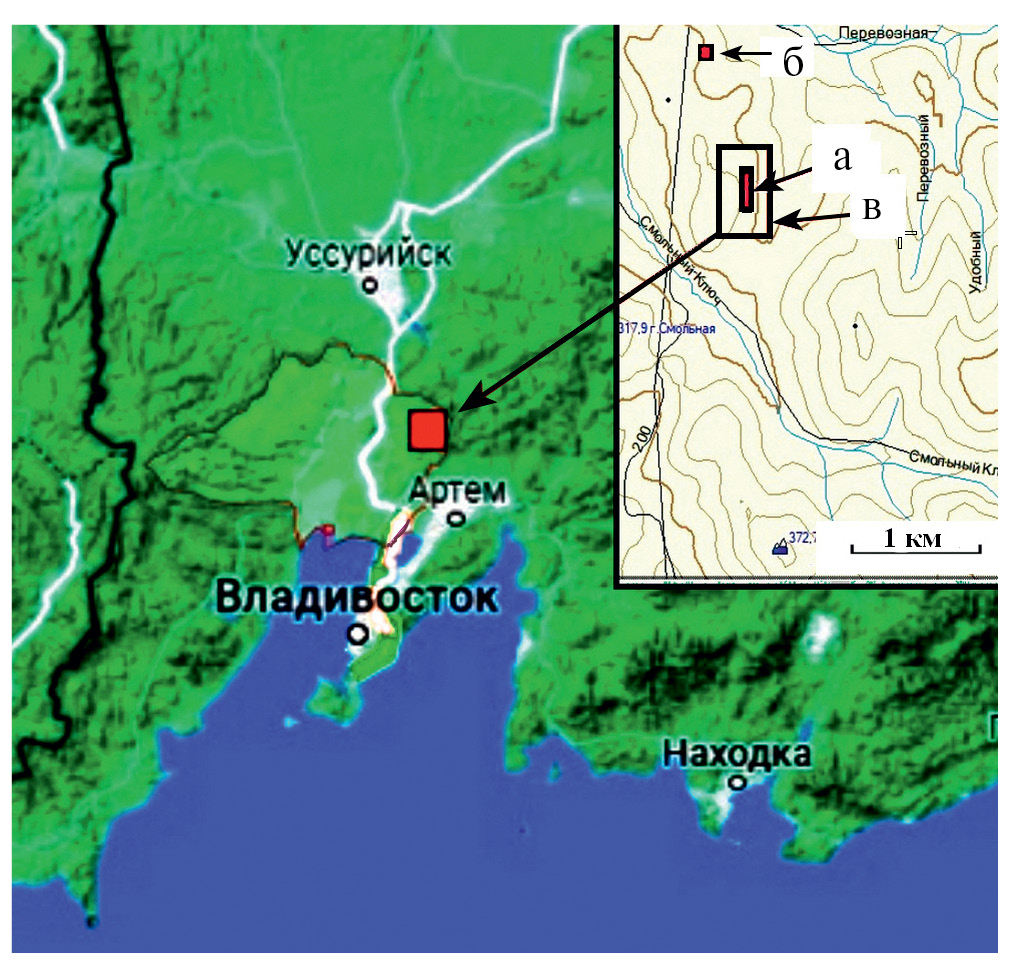 Рис. 2. Карта-схема местонахождений Alangium platanifolium в Приморском крае: a – находки A. platanifolium в 2001 г. (размер участка 1,2 га.); б – новая находка A. platanifolium в 2021 г. (размер участка 0,25 га); в – ревизия популяции A. platanifolium в 2022 г. (современный размер участка 10 га).