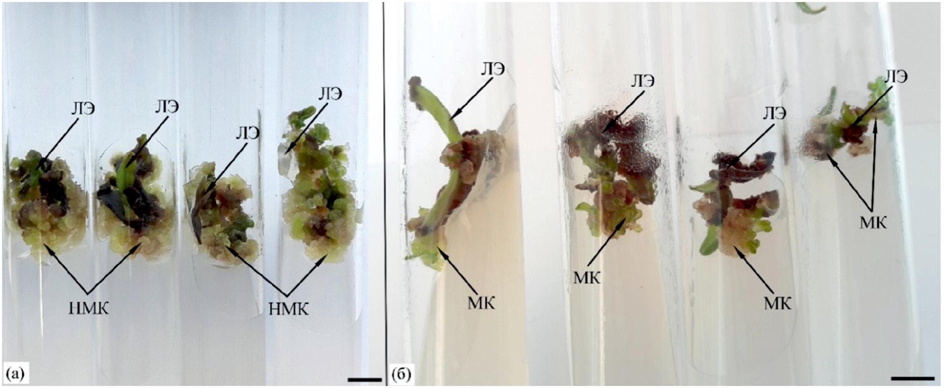 Рис. 1. Первичные неморфогенные (а) и морфогенные (б) каллусы L. angustifolia. Условные обозначения: ЛЭ — листовой эксплант; МК — морфогенный каллус; НМК — неморфогенный каллус. Масштаб: 10 мм