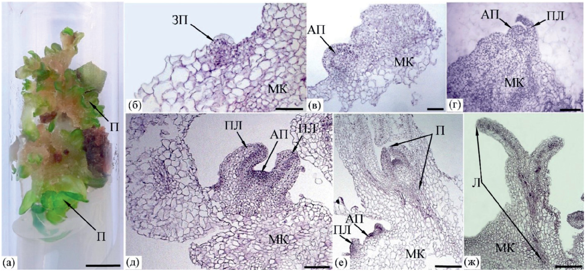 При органогенезе de novo в каллусах представлены листовые почки и листья в динамике развития от зачатков и апексов почек до примордиев и развернутых листьев (рис. 3, б–ж).