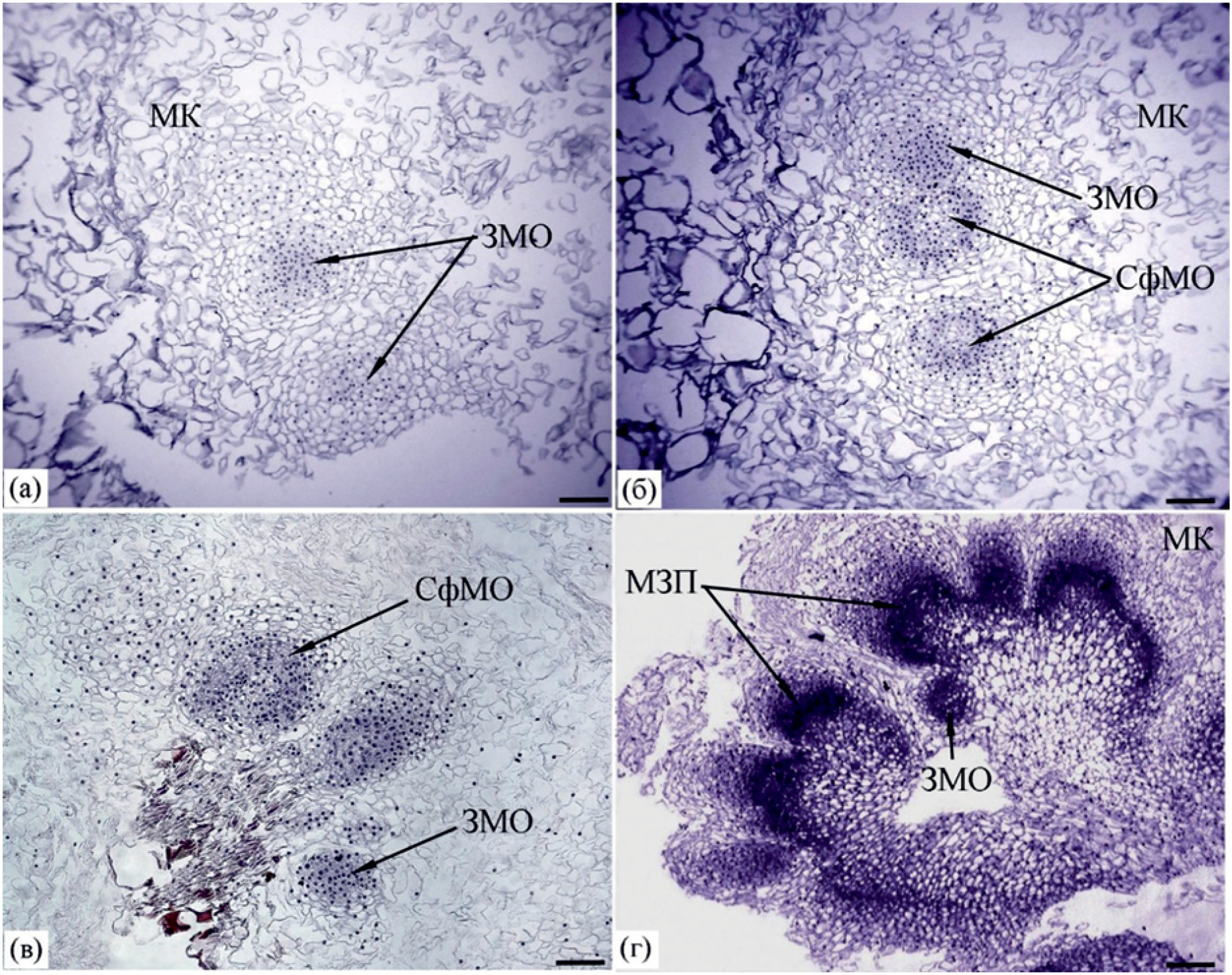 Рис. 5. Морфогенетические очаги в толще морфогенных каллусов 1 пассажа L. angustifolia: а, б — поперечные срезы, в, г — продольные срезы. Условные обозначения: ЗМО — заложившийся морфогенетический очаг, МЗП — меристематическая зона почки, МК — морфогенный каллус, СфМО — сформированный морфогенетический очаг. Масштаб: а–в — 100 мкм, г — 200 мкм