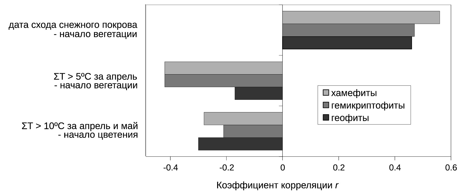 По нашим данным, высокие положительные корреляции (r = 0.46…0.56) дат начала вегетации с датой схода снежного покрова означают, что сроки наступления фенофазы согласованы с направлением тренда во всех биоморфологических группах, при задержке на 3—4 дня в 2015 г. по сравнению с 1996 г. Корреляции средних дат начала вегетации с накопленными суммами активных температур отрицательные, но варьируют по величине. Менее зависимыми от температур воздуха оказались геофиты: это холодостойкие ранневесенние эфемероиды (Anemonoides altaica, Corydalis bracteata, Erythronium sibiricum) или луковичные и корневищные виды с хорошо защищенными от внешних условий почками возобновления. У гемикриптофитов и хамефитов вегетативный рост происходит с одинаковой интенсивностью при температурах выше 5°C (r = –0.42), но у последних он возобновляется в среднем на 6 дней раньше (табл. 2). Анализ табл. 2 показывает, что тренд запаздывающего начала вегетации отмечался немногим более чем у половины многолетников, у 19—39 % видов даты начала вегетации не изменились, а для 10—22 % видов выявлено опережение.