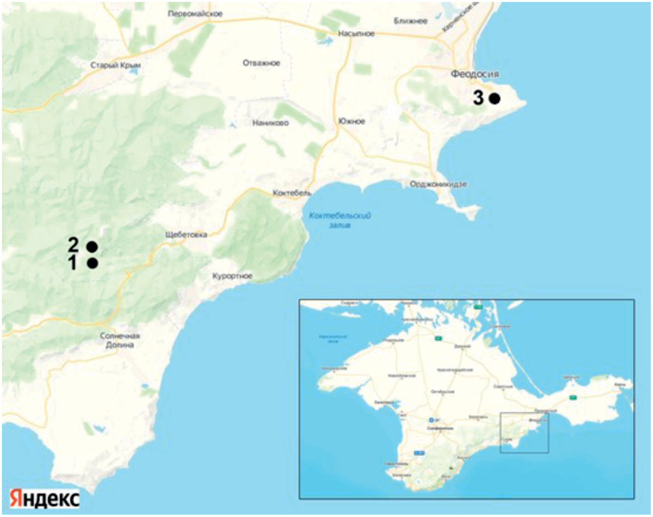 Рис. 1. Локалитеты Orchis purpurea в Юго-Восточном Крыму (цифрами обозначены номера ценопопуляций)