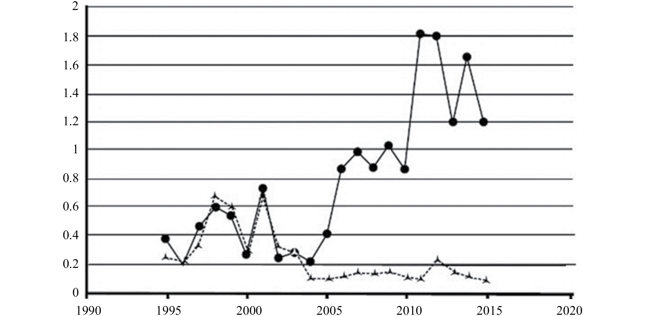 Рис. 4. Динамика радиального прироста скелетных корней сосны об. II класса возраста, произрастающей на щебенисто-каменистых почвах на Кольском Севере. По вертикали – прирост древесины корня в мм, по горизонтали – годы, сплошная линия – прирост скелетного корня от анатомической оси вверх; пунктирная линия – прирост скелетного корня от анатомической оси вниз.