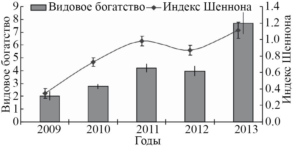Рис. 2. Динамика индексов биологического разнообразия эпибионтных сообществ камчатского краба на Восточном Мурмане в летний период 2009–2013 гг. Представлены средние значения (из расчета на одного заселенного хозяина) со стандартными ошибками.