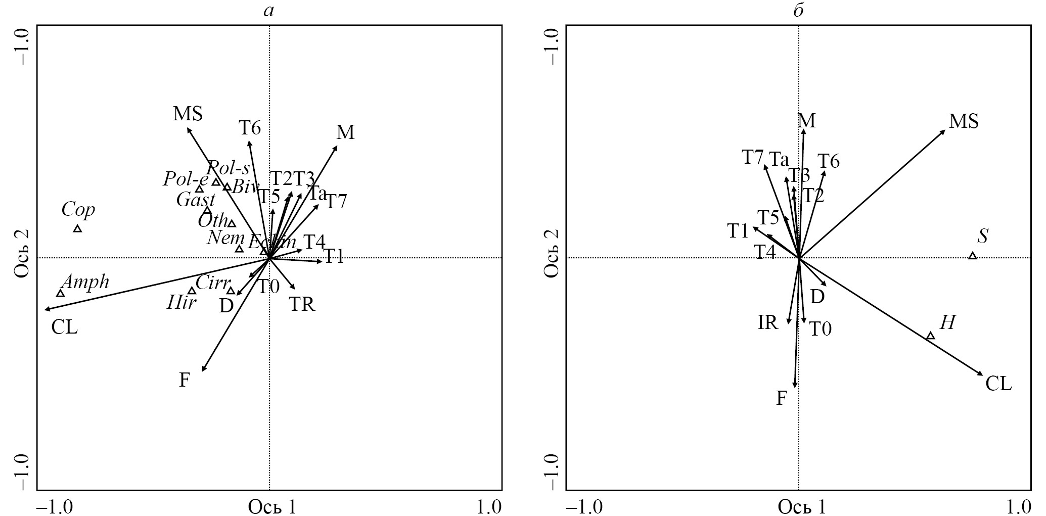 Рис. 3. Ординационные диаграммы, показывающие связь факторов среды со средней интенсивностью заселения крабов (а) и индексами биологического разнообразия эпибионтных сообществ (б). Независимые переменные: CL – длина карапакса, MS – стадия линьки, M – самцы, F – самки, D – глубина при отлове крабов, IR – число травмированных ног, Т0 – температура во время отлова краба, Т1–Т7 – температура воды прибрежной ветви Мурманского течения в слое 50–200 м в январе – июле, Тa – среднегодовая температура воды. Зависимые переменные (интенсивность заселения): Nem –Nemertea, Pol-s – Polychaeta (Sedentaria), Pol-e – Polychaeta (Errantia), Hir – Hirudinea, Gast – Gastropoda, Biv –Bivalvia, Cop – Copepoda, Amph – Amphipoda, Cirr – Cirripedia, Echin – Echinodermata, Oth – Прочие. S – количество видов, H – индекс Шеннона.
