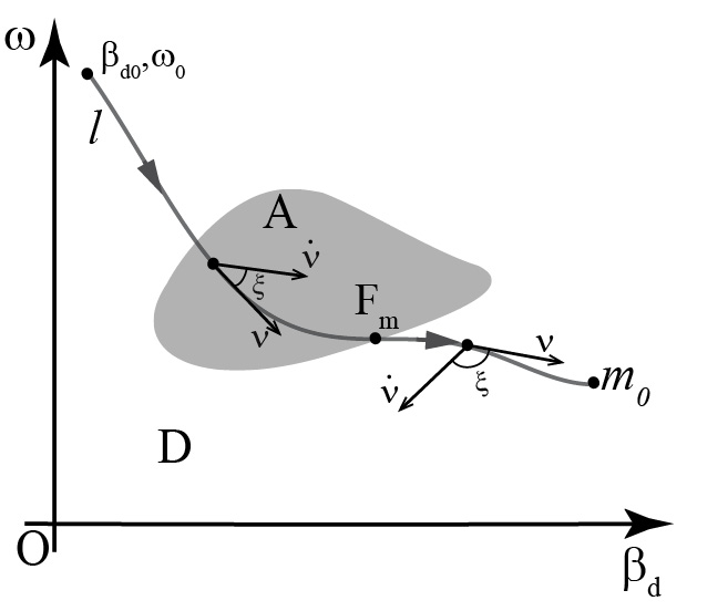 Основная идея [7] заключается в следующем: изображающая точка заменяется материальной точкой единичной массы, движущейся в плоскости Oβdω под действием условных обобщенных сил. Далее рассматривается движение материальной точки к устойчивому состоянию равновесия m0 вдоль криволинейной траектории l, совпадающей с траекторией изображающей точки (рис. 2).