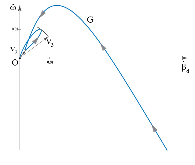 Рис. 4. Годограф фазовой скорости, построенный для судна “Волгонефть-71” при U = 5°, U∈[UBIF,Um]. Стрелками показано направление движения радиус-вектора с течением времени. Начальные условия: точка (βd0 =-0.4, ω0 =-0.5)∈C.