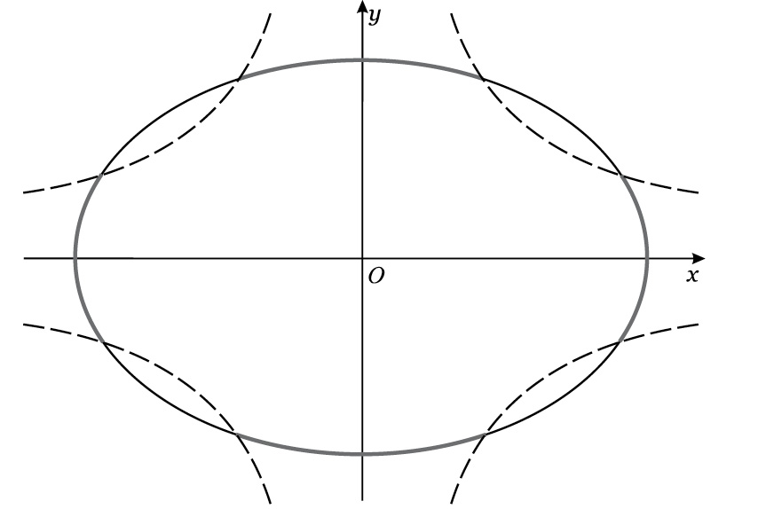 Задаваемая неравенством (3.7) область на плоскости (x, y) ограничена парой гипербол. Ее пересечение с задающим обруч эллипсом (3.1) всегда непусто: даже при μ = 0, т. е. когда трение отсутствует, имеют место равновесия на которых обруч подвешен за концы своих полуосей (рис. 2).