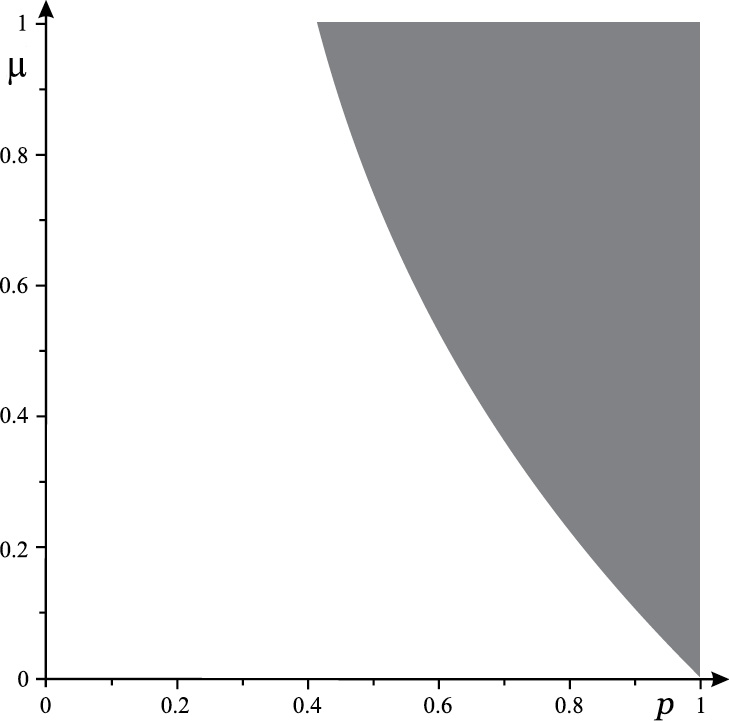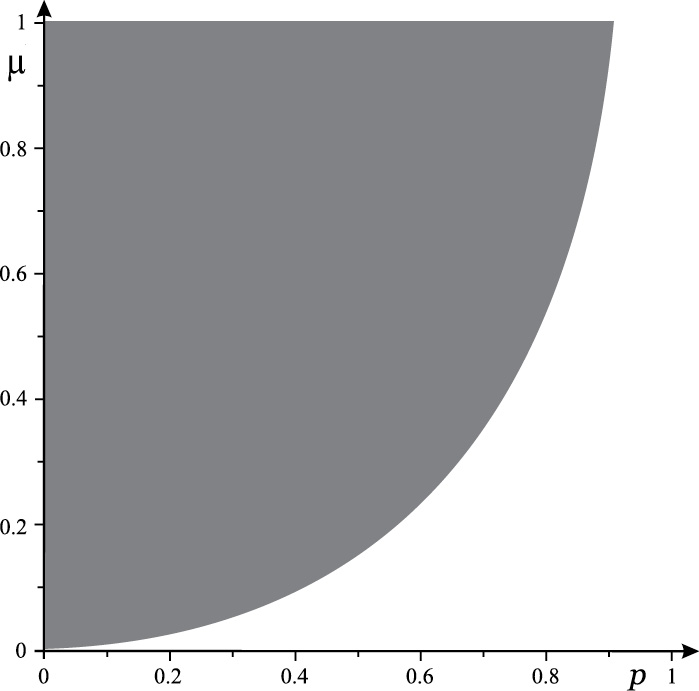 Рис. 4. Темной области на плоскости параметров (p, μ) отвечают точки, для значений которых обруч будет находиться в равновесии при подвешивании за любую его точку