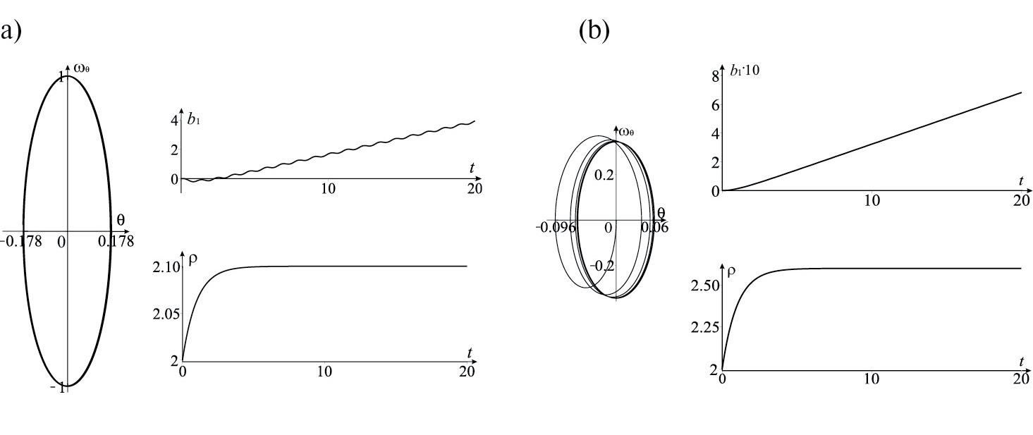 Замечание 3. Отметим, что система (3.5) имеет особенность в точках что является исключительно следствием выбора переменных. Особенность пропадает при движении робота по прямой. Также при свободных колебания маятника проблему можно решить соответствующим выбором начального условия так как характеризует неустойчивое положение маятника. Однако, при управлении сферическим роботом посредством маятникового привода выбор соответствующего начального значения не решит проблему. Поэтому при движении робота по криволинейной траектории имеет смысл интегрировать в исходных переменных.