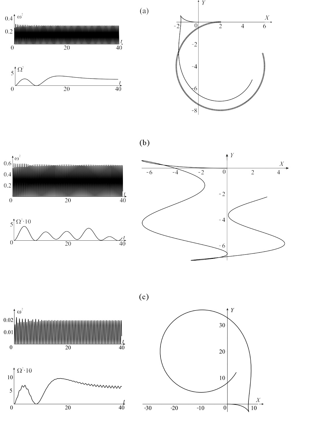 Согласно численным экспериментам при движении цели с постоянной скоростью, система (3.6) при приобретает периодическую динамику. Имеет место вековой уход траекторий точек платформы вдоль оси .