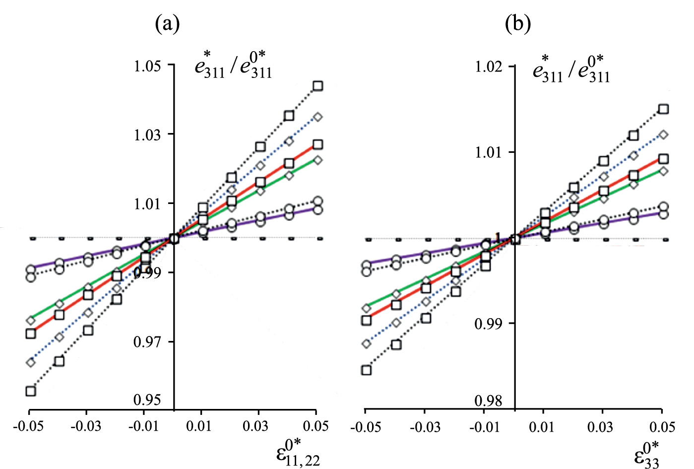 Рис. 8. Эффективный пьезомодуль e311* пористой керамики PZT-4 с объемной долей туннельных пор v= 0.2 (○), 0.6 (◊), 0.8 (□) в зависимости от начальных макродеформаций ε11,220*0 при ε330*=0 (a), ε330*0 при ε11,220*=0 (b), E0*=0.