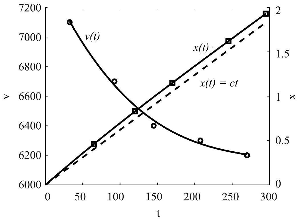 Из рис. 5 следует, что скорость распространения импульса сжатия релаксирует в неравновесной области от начального значения 7100 м/с до стационарного значения 6200 м/с. График траектории движения импульса x(t) также иллюстрирует релаксационный характер распространения импульса сжатия, отклоняясь от стационарной траектории x(t) = ct.