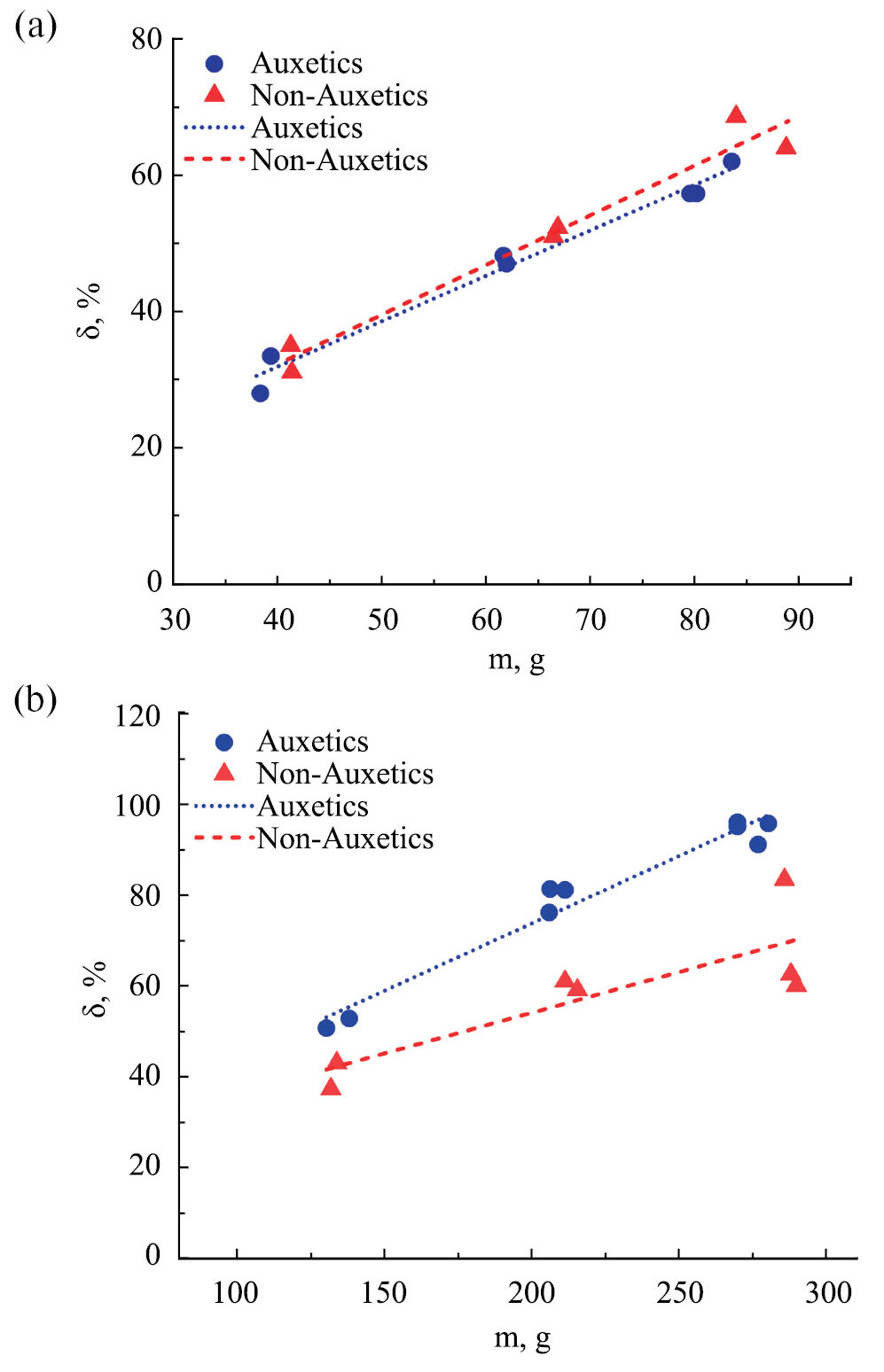 На рис. 3, а представлена зависимость относительной потери кинетической энергии ударника (%) от массы m [г] пробиваемых образцов. Для наглядности добавлены линейные линии тренда для АС-образцов (синяя) и неауксетиков (красная). Видно, что линии тренда проходят очень близко, при этом сотовые неауксетические образцы чуть лучше сопротивляются пробиванию. Были также подготовлены и испытаны ауксетические и неауксетические образцы, заполненные желатином (из расчета 50 г желатина на 500 г воды) и примерно равные по массе. Экспериментальные зависимости величины от m для ауксетических и неауксетических структур с желатиновым наполнением приведены на рис. 3, б и показывают, что АС-образцы в данном случае существенно эффективнее неауксетитических образцов.
