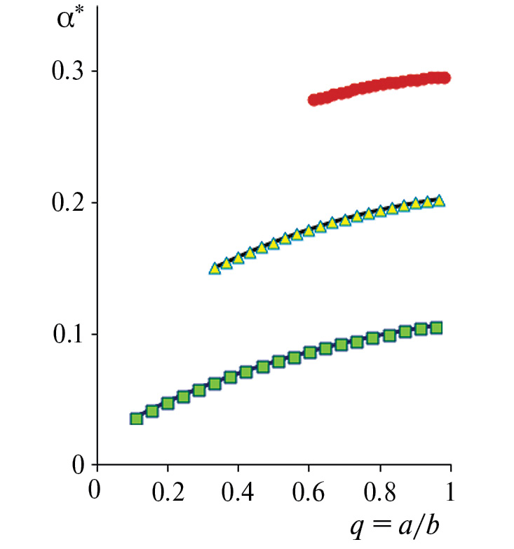 6. Результаты численного моделирования. Осуществим расчет и численный анализ упругих и электрических полей внутри составной ячейки при различных случаях ее электромеханического нагружения (, , Ucon) и прогнозирование эффективных упругих k *, c*1′3′ и пьезоэлектрических *, *1′, *3′ констант (5.1) (5.8) композитного FibrCD-актюатора (рис.1). Электроупругие постоянные керамики PZT-5 приведены в табл. 1 [1, 2], модули Юнга и коэффициенты Пуассона изотропных упругих свойств электропроводной жилы: E(e) = 80 ГПа, n(e) = 0.37 (серебро) и эпоксидного связующего: E(m) = 20 ГПа, v(m) = 0.35. На рис. 4–6 даны графики распределений электроупругих полей по радиальной координате r при значенииях радиусов: a0 = 0.1 мм, a = 0.15 мм, b = 0.17 мм и различных условиях нагружения: =10 МПа, Ucon = 0 В (рис. 4), Ucon ≠ 0 (рис. 5, 6) составной ячейки. На рис. 5 графики функций, полученные для различных граничных условий: = 0 или = 0 на внешнем контуре составной ячейки при Ucon = 1500 В, обозначены маркерами с заливкой (цветные) и без заливки (белые) соответственно. При этом для случаев на рис. 6 (Ucon = 1500 В, 500 В) установлено, что на графики электрического потенциала ö (рис. 6,a), напряженности (рис. 6, b) и индукции (рис. 6, c) практически не влияет различие задаваемых граничных механических условий: = 0 или = 0 на внешнем контуре составной ячейки. В табл. 2 численные значения эффективных упругих и пьезоэлектрических констант композита (рис. 3,b) также получены для случая a0 = 0.1 мм, a = 0.15 мм, b = 0.17 мм. На рис. 7, 8 даны графики зависимостей эффективных коэффициентов пьезоэлектрического расширения a* (рис. 7) и пьезоэлектрических напряжений *1′, *3′ (рис. 8) композита от структурного параметра q = a/b при различных значениях радиуса электропроводной жилы a0 с учетом области допустимых значений , где начальное значение q0 = a0/b.