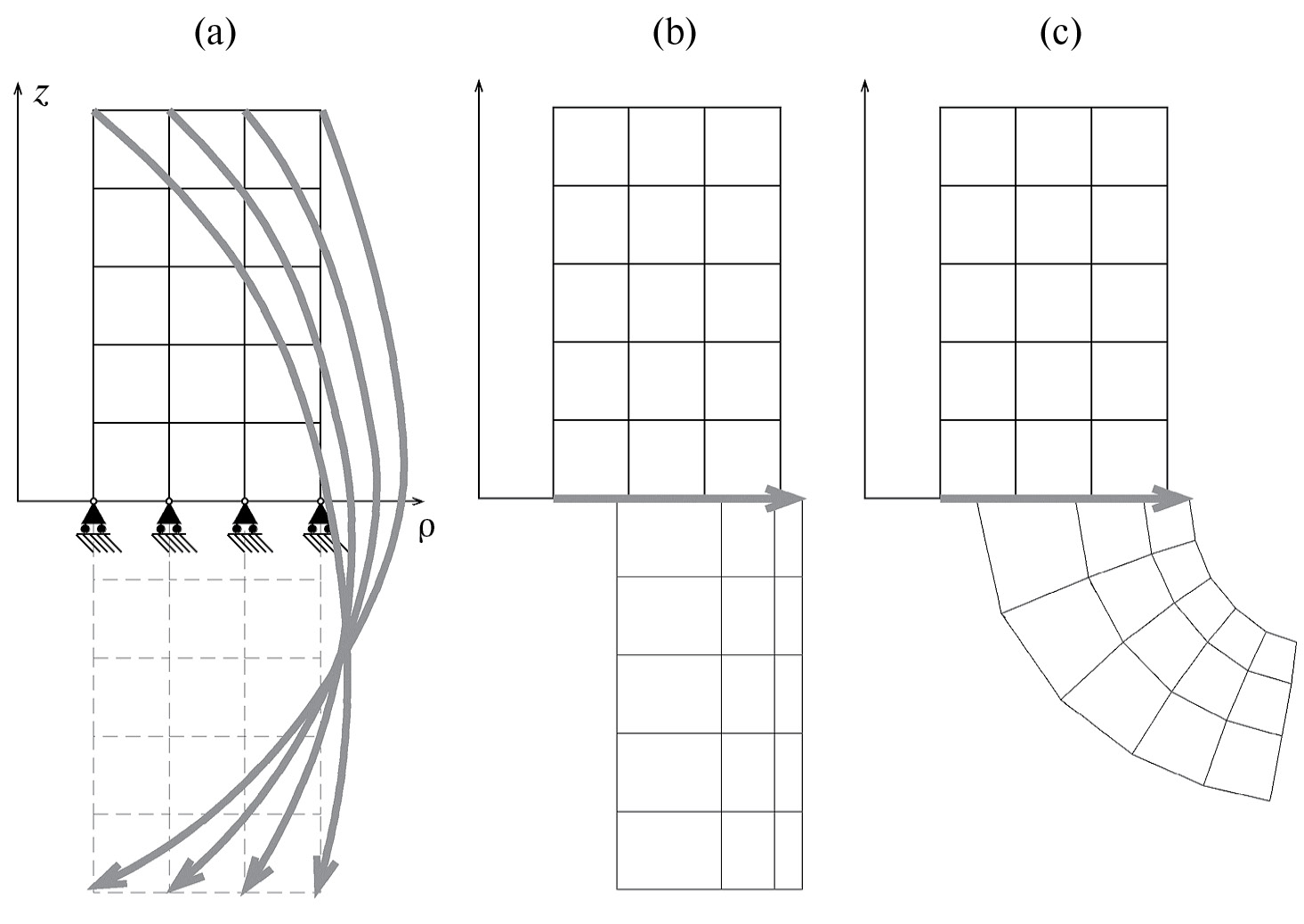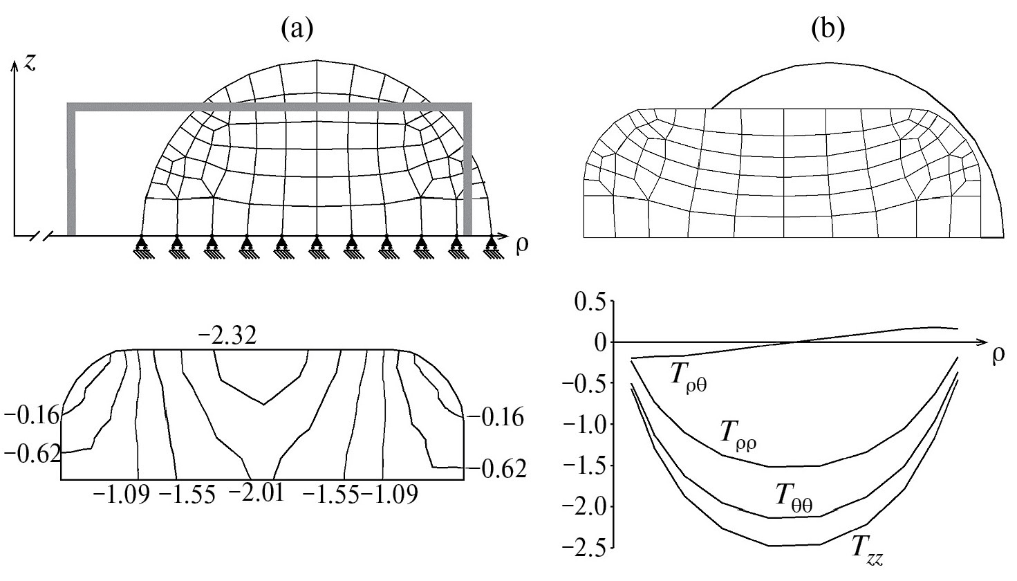 Определение состояния вывернутого наизнанку кругового цилиндра относится к непростым задачам нелинейной упругости [10]. В [23] был рассмотрен пример вычисления этого состояния как задача плоской деформации, а теперь аналогичный расчет этой же модели был проведен в сечении другой координатной плоскости, уже как осесимметричная задача. Расчетная схема МКЭ для этой задачи, а также начальное приближение, показаны на рис. 1, a. У исходной формы цилиндра внутренний и внешний радиусы равны соответственно 3 и 12 см, высота 15 см. Константы материала: 1C = 0.15 МПа, 2C = 0.094 МПа. Граничные условия в перемещениях задавались с точки зрения обеспечения плоской деформации: узлы конечноэлементной сетки, находящиеся на нижнем торце исходной конфигурации цилиндра, зафиксированы в направлении оси z, а для узлов, находившихся до деформирования на верхнем торце, задано в виде ограничения значение z-координаты в деформированном состоянии, обеспечивающее сохранение начальной высоты цилиндра. Фиксация узлов вдоль радиальной координаты поначалу не производилась, поскольку ожидалось, что ее значения будут получены в процессе расчета. Однако при этом выявились проблемы со сходимостью, которая не была достигнута даже после 5000 итераций (этот же эффект наблюдался и в другой задаче, см. ниже). Эти проблемы могут быть связаны с возможной неединственностью решения нелинейной задачи (например, здесь с точки зрения механики возможны решения, когда вывернут не весь цилиндр, а только некоторая его часть). Когда же в одном из узлов было в качестве ограничения задано перемещение по оси r, величина которого взята из решения соответствующей задачи плоской деформации [23], то процесс сошелся за 6 итераций. Результат расчета показан на рис. 1, b. Значения радиальных координат ρ[i] слоев узловых точек в полученном решении в сравнении с аналогичными величинами из решения, вычисленного ранее по теории плоской деформации, приведены в таблице: