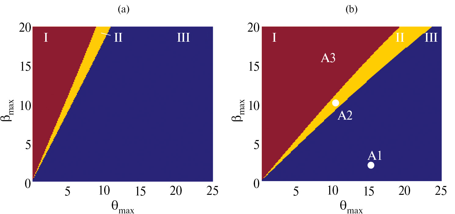 Рис. 7. Карты направления сдвига (I – сдвиг, II – сбросо-сдвиг, III – сброс) в плоскости зоны локализованной поврежденности для различных углов ее ориентации при k = 0.5 (a) и k = 1 (b) (точками указаны рассматриваемые случаи ориентаций зоны локализованной поврежденности).