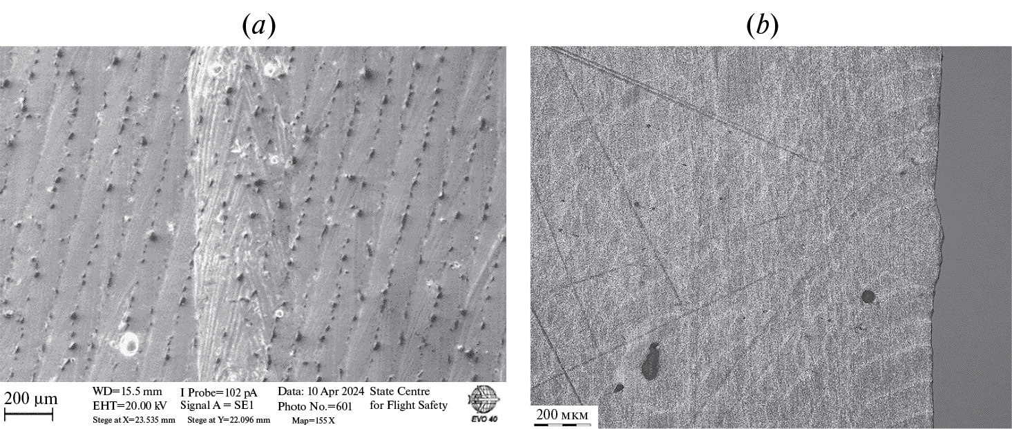 Рис. 4. Наблюдаемая в электронный микроскоп структура напечатанного алюминиевого сплава, а) – вид сверху, q0 = 370 Вт, v = 650 мм/с, электронный микроскоп, b) – сечение приповерхностного слоя, q0 = 370 Вт, v = 450 мм/с, оптический микроскоп.