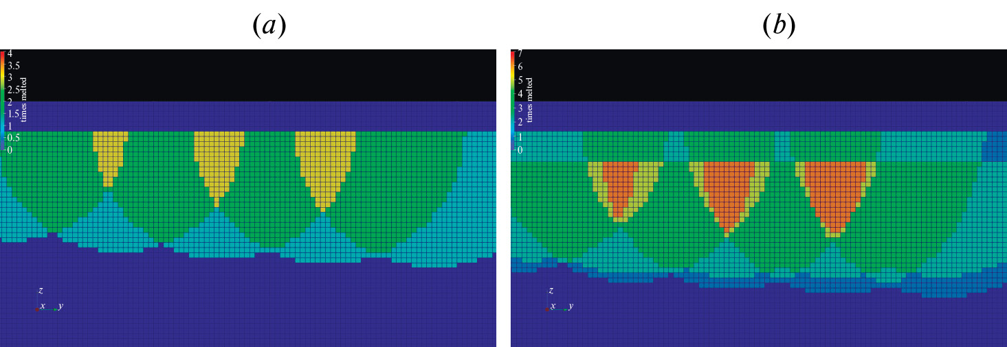 Для трехслойной (рис. 5, a) и четырехслойной (рис. 5, b) печати разным цветом показаны области с многократным переходом из жидкого в твердое состояние (переплавы, синий цвет – 0 переходов, жёлтый – 3 перехода, оранжевый – 4 перехода).