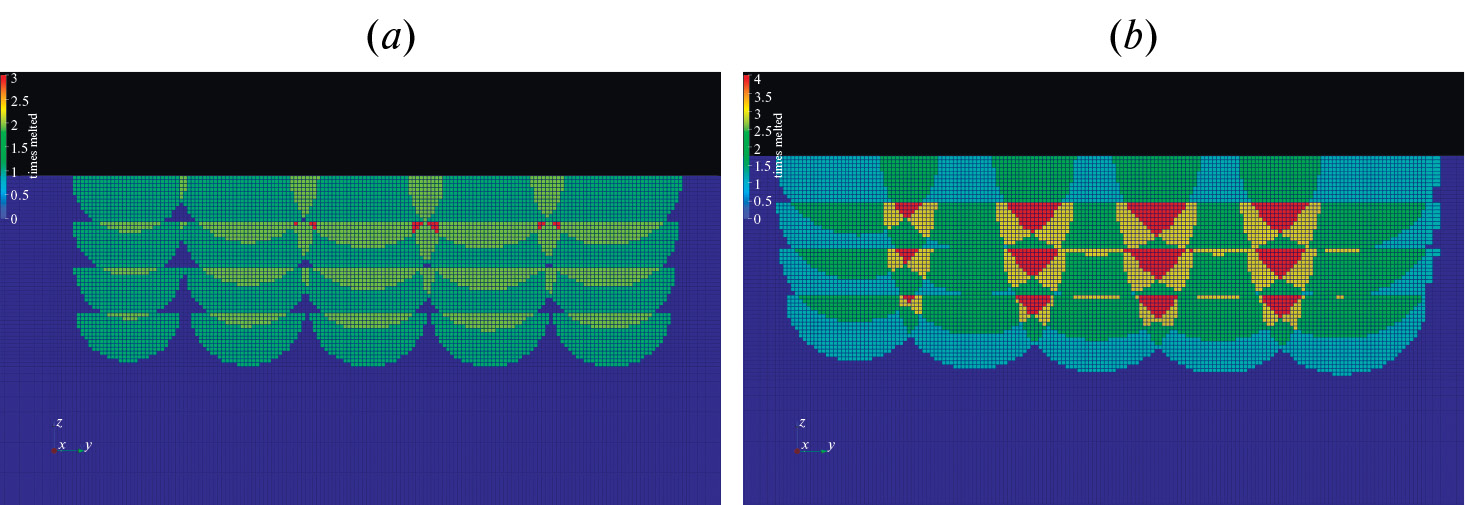 Рис. 7. Результаты расчета структуры дефектов для титанового сплава, a) – q0 = 50 Вт, v = 1000 мм/с, недоплавы, b) – q0 = 50 Вт, v = 500 мм/с, множественные переплавы, недоплавы отсутствуют.