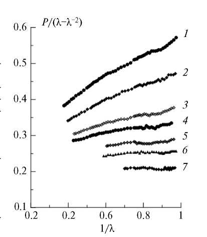 Рис. 1. Экспериментальные кривые одноосного растяжения эластомера ПБУ-1 при различных концентрациях ДБС, представленные в координатах Муни-Ривлина: 1 – φ2 = 1; 2 – φ2 = 0.682; 3 – φ2 = 0.469; 4 – φ2 = 0.364; 5 – φ2 = 0.277; 6 – φ2 = 0.204; 7 – φ2 = 0.126.