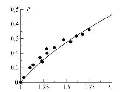 Рис. 3. Экспериментальная зависимость термодинамически равновесной упругой реакции эластомера ПБУ-4 при одноосном растяжении в ДБС. Сплошная линия рассчитана по уравнениям (5.6)–(5.9) с константами, представленными в таблице. Величина P измеряется в МПа.