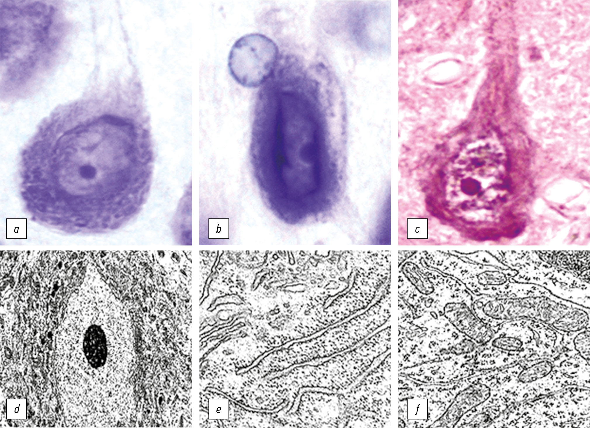 Рис. 1. Нейроны коры головного мозга крысы в норме (a, d, f) и при холестазе (b, c): a–с — световая микроскопия, внутренний пирамидный слой лобной коры (a, b — окраска по Нисслю, c — окраска гематоксилином и эозином; ×1000); d–f — электронная микроскопия, клетки Пуркинье мозжечка (d — общий вид, ×5000; e — гранулярная эндоплазматическая сеть; f — митохондрии и свободные рибосомы, ×50 000). / Fig. 1. Neurons of the rat brain in normal conditions (a, d, f) and with cholestasis (b, c): a–с — light microscopy, the inner pyramidal layer of the frontal cortex (a, b — Nissl staining, c — staining with hematoxylin and eosin; ×1000); d–f — electron microscopy, Purkinje cells of the cerebellum (d — general view, ×5000; e — granular endoplasmic reticulum; f — mitochondria and free ribosomes, ×50 000).