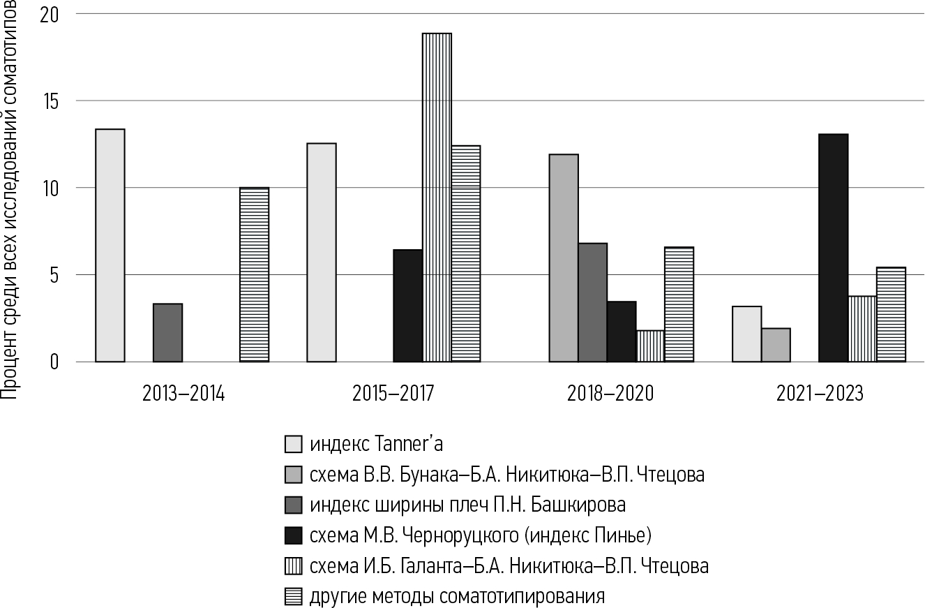 Среди оригинальных исследований было найдено 193 полнотекстовые статьи, содержащие прямые указания на методики соматотипирования. На основании полученных данных определяли использованную в работе схему соматотипирования и принадлежность работы к одному из пяти направлений: клинические аспекты соматотипирования, исследование обучающихся юношеского и первого зрелого возраста, соматотипирование женщин, спортивные аспекты соматотипирования, «другие» исследования. На основании полученных результатов строили графики. Для исследования динамики востребованности схем соматотипирования частόты их упоминаний рассчитаны отдельно для интервалов 2013–2014 гг., 2015–2017 гг., 2018–2020 гг., 2021–2023 гг. Все вычисления проводили с использованием электронных таблиц Excel.