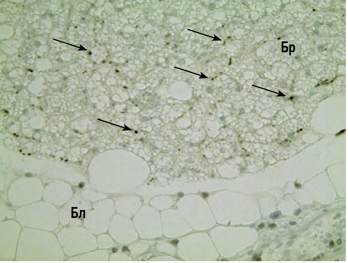 Fig. 3. Tyrosine hydroxylase-immunopositive nerve structures in adipose tissue. Here: Бр — brown adipose tissue; Бл — white adipose tissue; ↑↑ — nerve structures. Immunohistochemical reaction to tyrosine hydroxylase, hematoxylin staining; ×400.