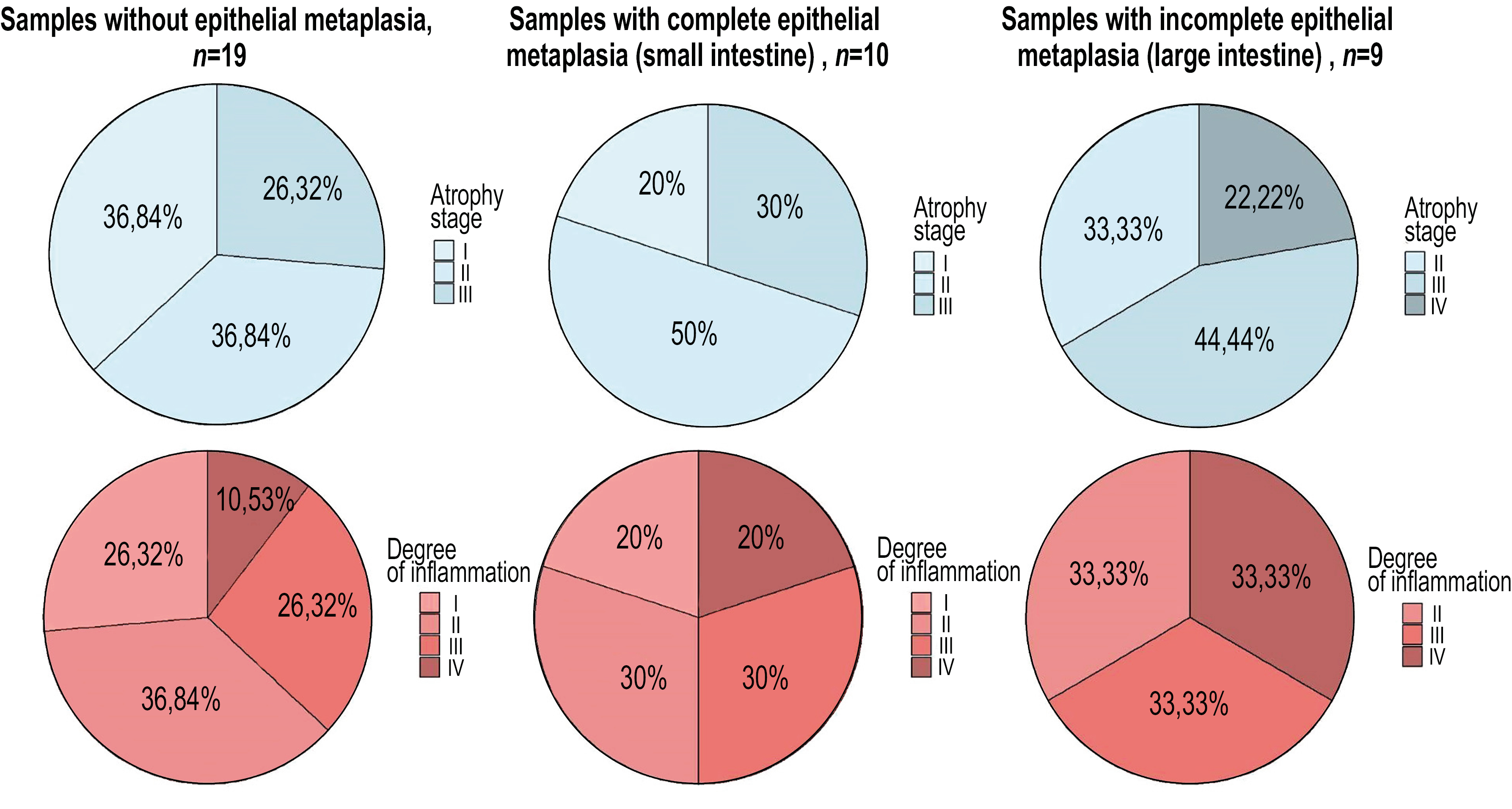 A total of 38 cases of chronic atrophic gastritis were analyzed. All patients were treated on an outpatient basis. Depending on the morphological changes in the gastric mucosa, they were divided into three groups comparable by sex and age (p >0.05), namely, in 19 cases, metaplastic changes in the epithelium of the gastric mucosa were determined (10 cases of complete metaplasia in the small intestine and 9 cases of incomplete metaplasia of the large intestine), and intestinal metaplasia was absent in 19 cases. Depending on the number of glands and their structure, stage I atrophy was established in 4 cases, stage II in 14, stage III in 13, and stage IV in 7. The ratios of atrophy stages and degree of inflammation within the groups are presented in Fig. 1.