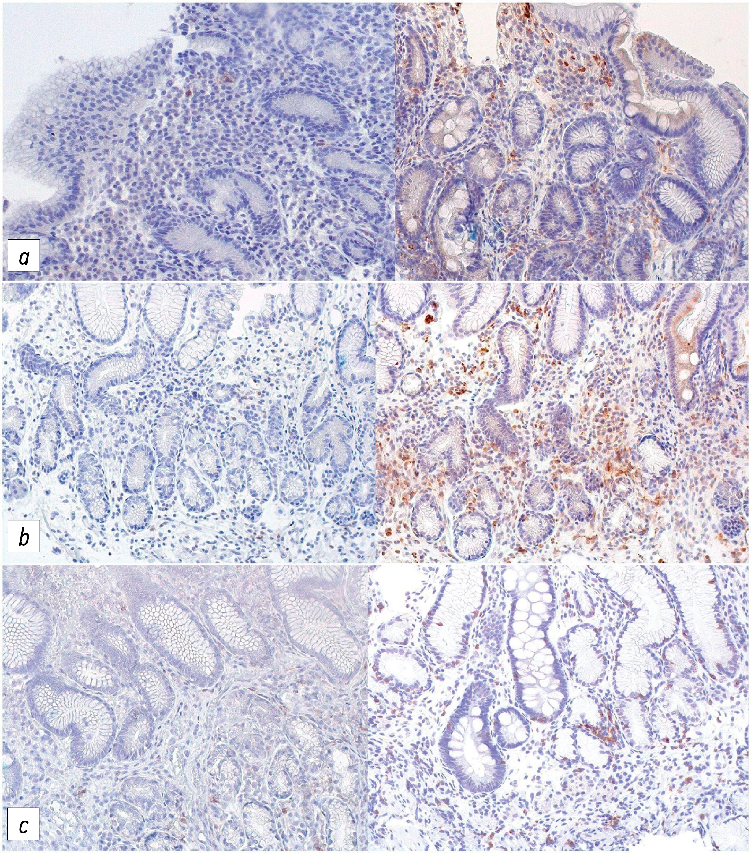 Fig. 3. Microphotographs of the gastric mucosa of patients with chronic atrophic gastritis without metaplasia — on the left, with intestinal metaplasia — on the right; ×200. Immunohistochemical study with primary antibodies to: a — CD68 (macrophages); b — CD8 (T-cytotoxic lymphocytes); c — CD138 (plasmocytes).