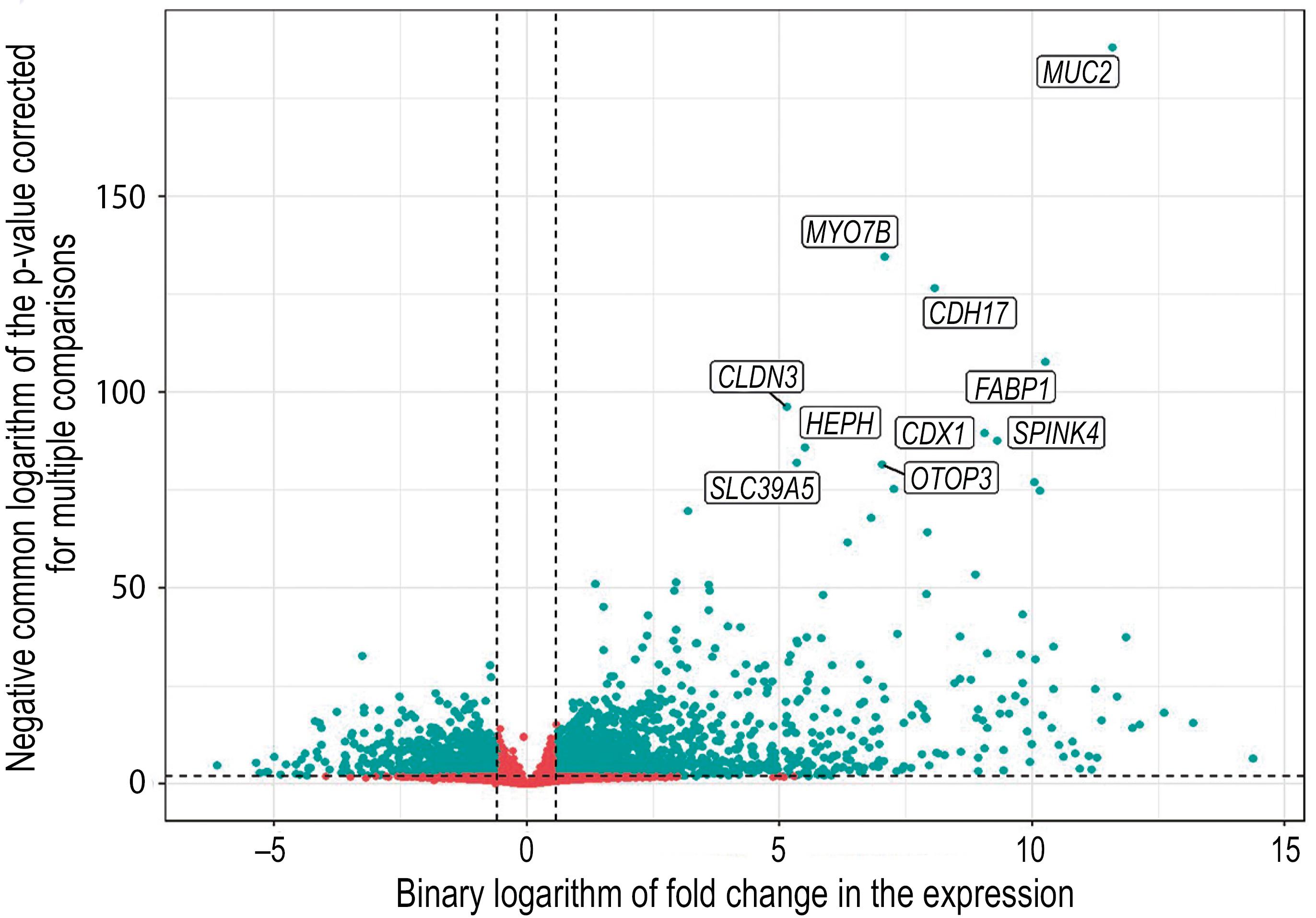 To detect genes which expression changes during the development of gastric mucosal epithelial metaplasia, differential gene expression analysis was performed. The quality of the samples was tested using principal component analysis. Eight transcriptomes were removed due to the presence of intermediate phenotypes. In 12 samples, 3118 genes with an expression change in >1.5 times in the metaplasia group were detected (Appendix 1), including 1843 genes with increased expression and 1275 with decreased expression (Fig. 4). Hierarchical cluster analysis revealed the presence of two patterns of genes, whose expression differs between the groups and allows dividing the samples into two clusters (Fig. 5). The 10 genes with the highest expression are presented in Table 2.