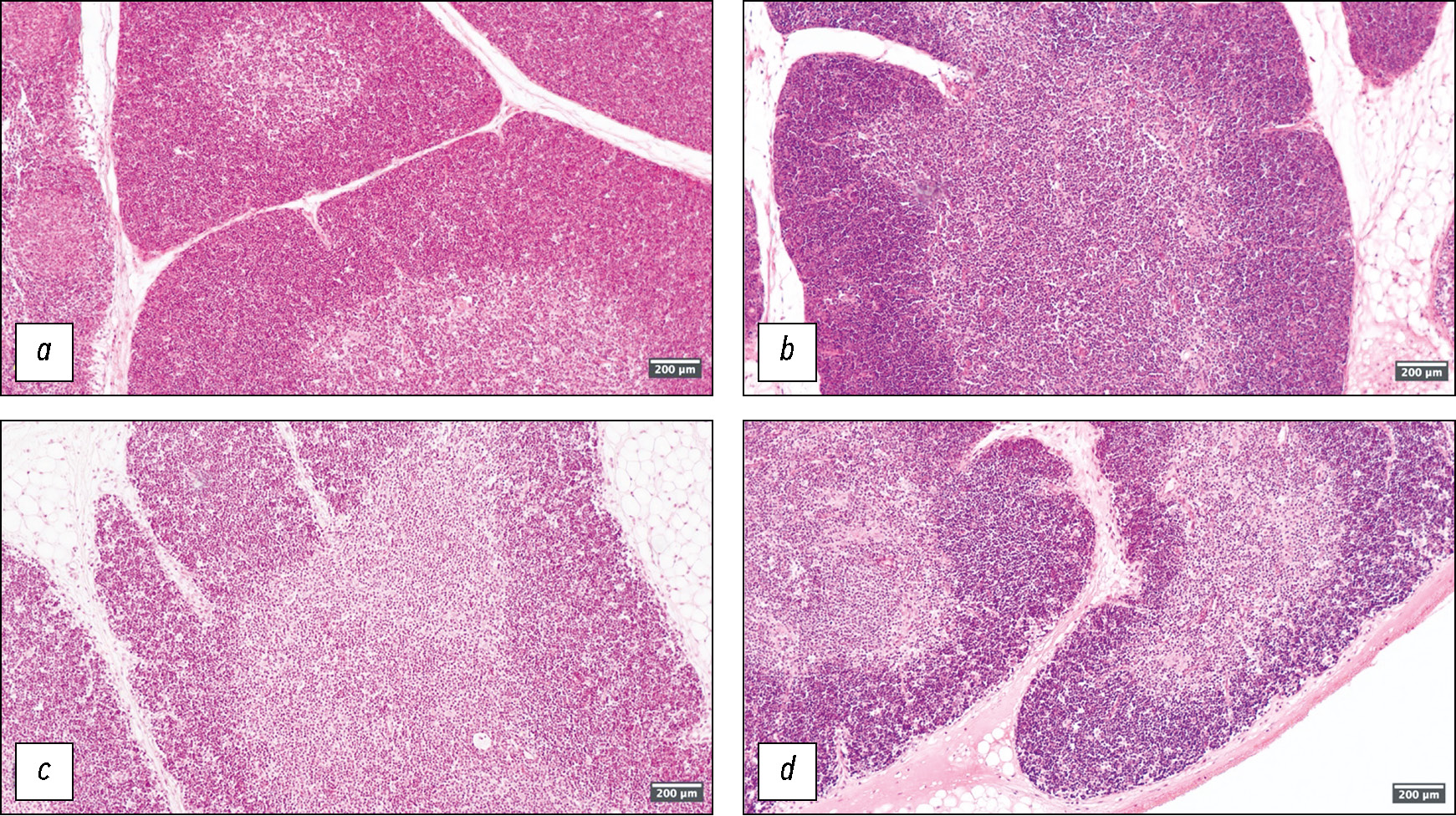 Рис. 2. Морфологическая характеристика тимуса самцов и самок крыс контрольной группы и через 24 ч после введения липополисахарида. Окраска гематоксилином и эозином, ×200: a, b — тимус самца и самки контрольной группы, соответственно (корковое вещество долек плотно заселено лимфоцитами, границы между корковым и мозговым веществом чёткие); c, d — тимус самца и самки через сутки после введения липополисахарида, соответственно (острая акцидентальная инволюция, корковое вещество опустошено, картина «звёздного неба», границы между корковым и мозговым веществом очагово нечёткие)