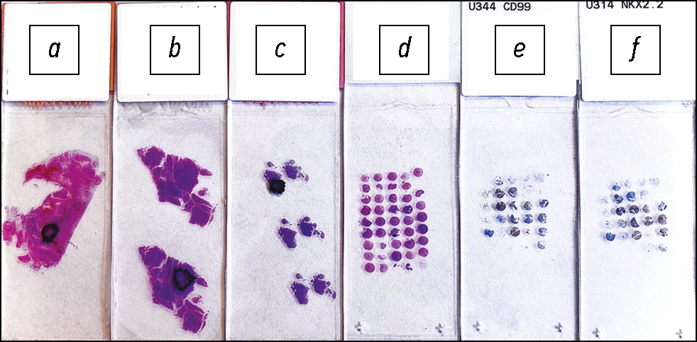 Рис. 3. Общий вид микропрепаратов: a–c — микропрепараты с отмеченными зонами интереса, окрашивание гематоксилином и эозином; d — микропрепарат с тканевой микроматрицей, окрашивание гематоксилином и эозином; e, f — микропрепараты, окрашенные иммуногистохимическим методом на CD99 и на транскрипционный фактор NKX2.2 соответственно.