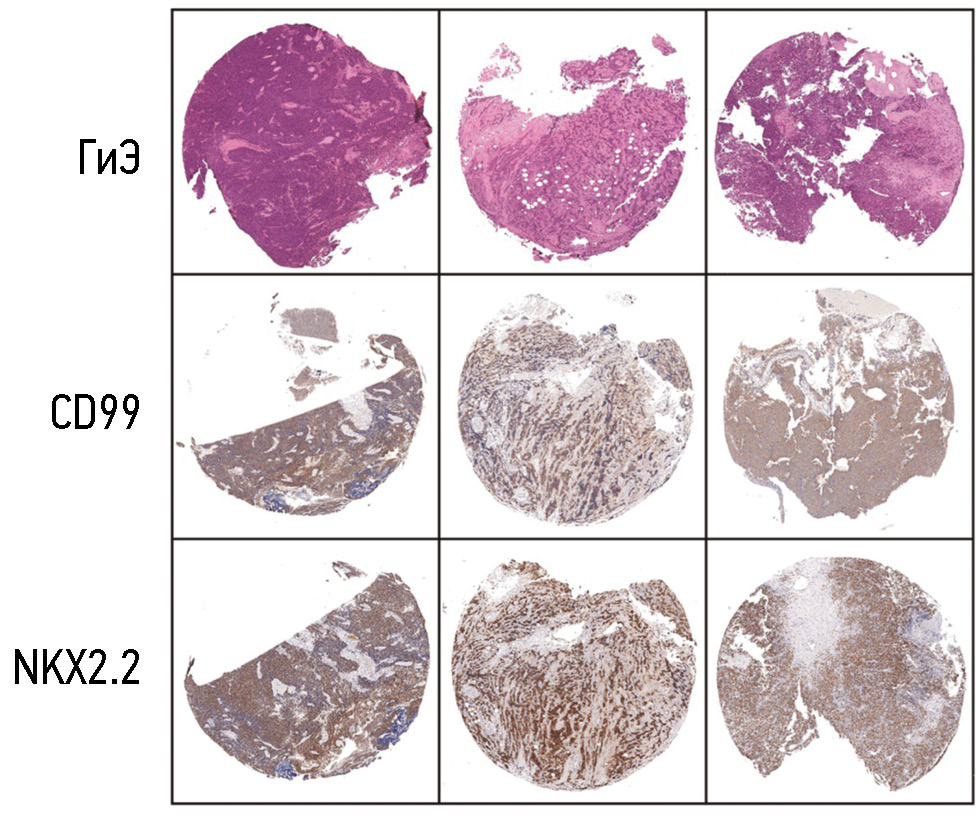 Рис. 4. Результаты исследования пациентов с саркомой Юинга: ГиЭ — препараты, окрашенные гематоксилином и эозином, ×40; CD99 — препараты, окрашенные иммуногистохимическим методом на CD99, ×40; NKX2.2 — препараты, окрашенные иммуногистохимическим методом на транскрипционный фактор NKX2.2, ×40. Показаны только препараты с положительной реакцией с антителами к маркерам CD99 и NKX2.2.
