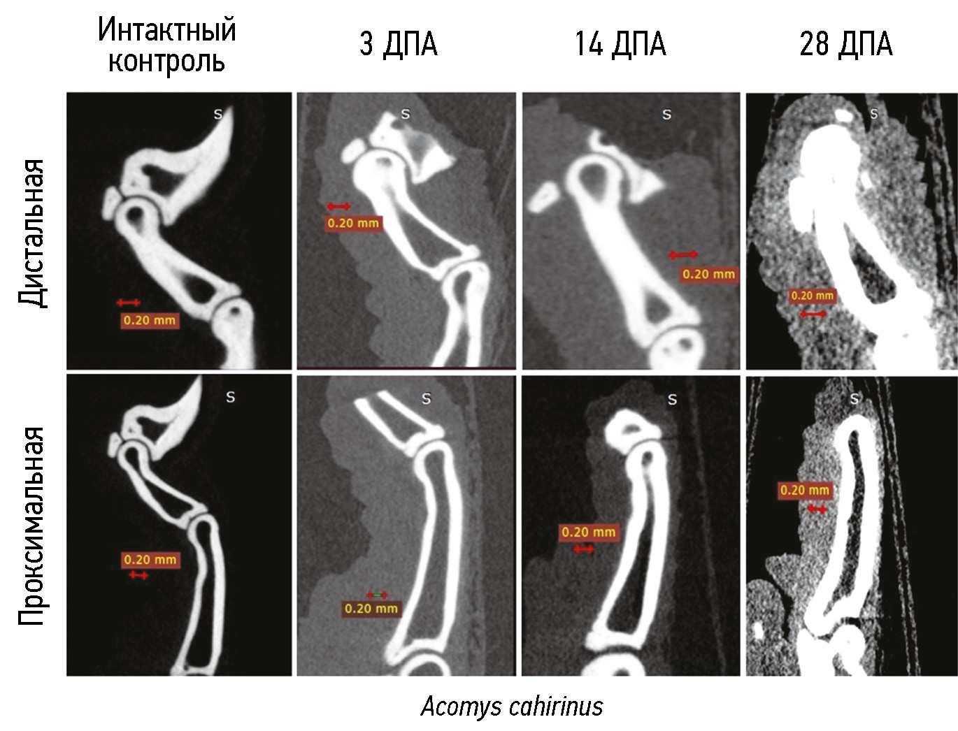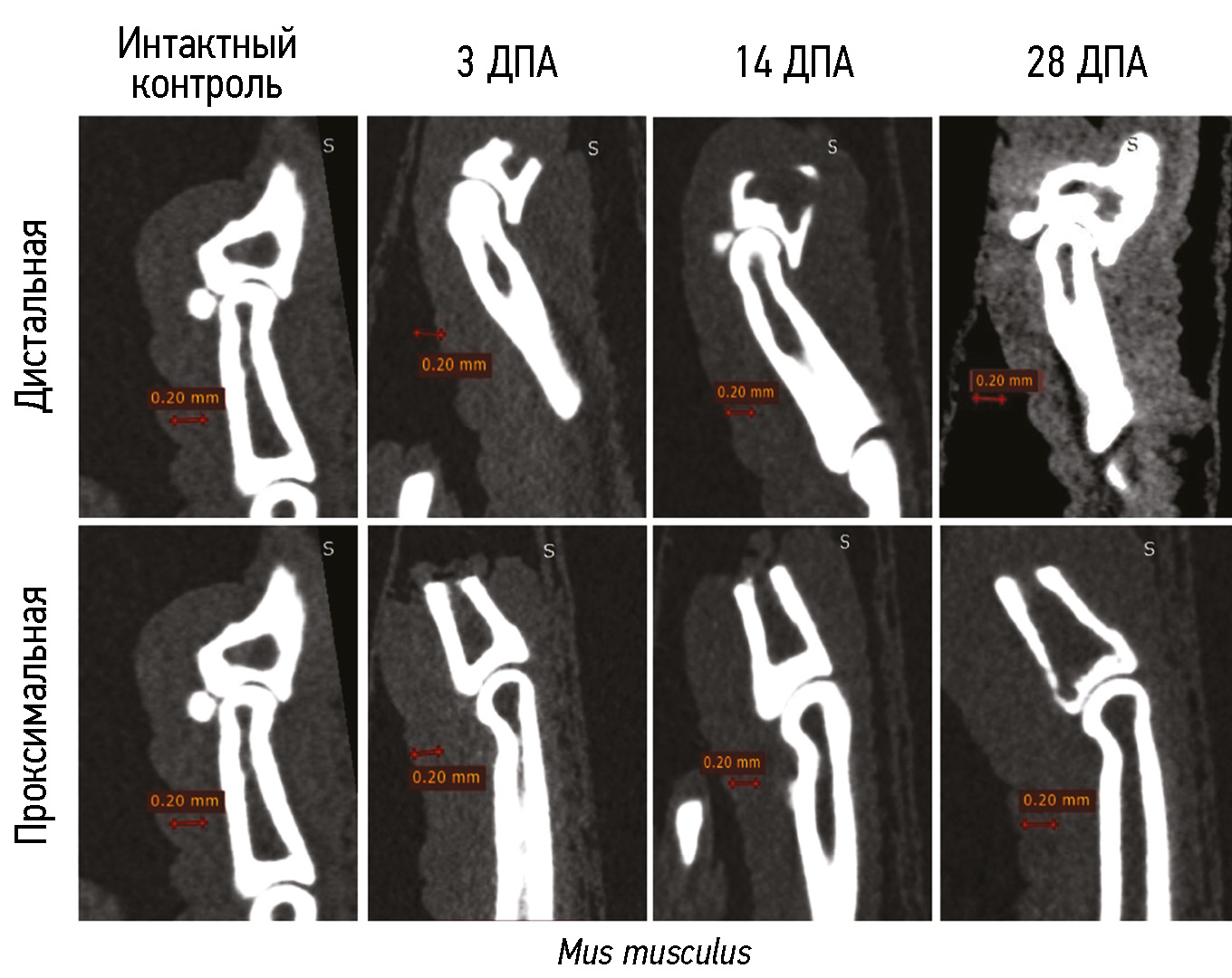 Для оценки изменений костей пальцев после ампутации фрагментов дистальных фаланг мы провели микрокомпьютерную томографию конечностей. У M. musculus через 14 ДПА происходит частичная деградация костной культи, часто с формированием секвестра (рис. 3). Однако через 28 ДПА можно наблюдать восстановление кости третьей фаланги. По форме кость соответствует неповреждённой и содержит лакуну костного мозга. Полученный результат полностью воспроизводит опубликованные ранее данные [1].