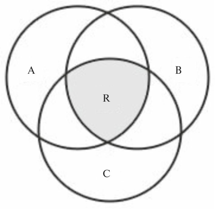 Здесь кругами изображены знания (A, B, C) о предмете конституционного права при его различном понимании. Пересечение кругов серого цвета показывает то общее, что есть между ними – своего рода «сердцевину» представлений о предмете конституционного права. Это и есть философская категория «отношение», обозначенная буквой R (от англ. relation – отношение) как исходная клеточка процесса восхождения к искомому целостному знанию о предмете конституционного права, выступающему как «единство многообразного».
