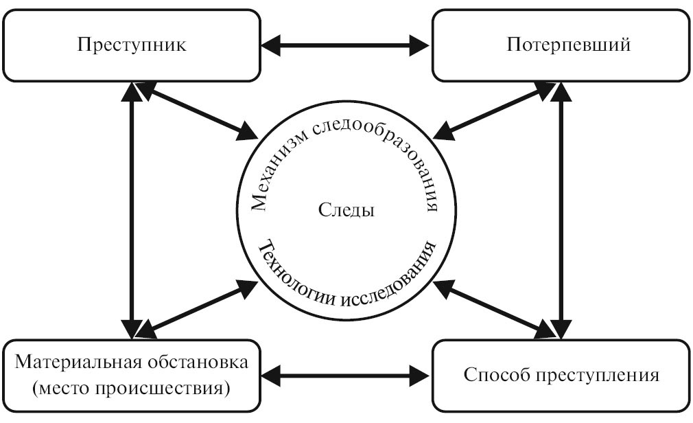 Обобщая вышеизложенное, заключаем, что предложенный в середине прошлого века К. Д. Полем для наглядного отражения взаимосвязи между местом происшествия, потерпевшим, орудием преступления и преступником принцип перекрестного переноса следов, схематически выраженный в «кресте следов», должен претерпеть изменения, которые связаны с особенностями механизма следообразования. «Крест следов» был отражением механизма следообразования исключительно в трасологии, когда большинство криминалистов не видели еще различий между дефинициями «следоведение» и «трасология». Г. Л. Грановский, Б. И. Шевченко и ряд других авторов утверждали, что объектами следоведения являются только следы-отображения29. Но при этом Г. Л. Грановский дал характеристику «видам энергии или воздействий, в результате которых образуется след», обозначив эти воздействия как физическое, химическое и биологическое. Хотя он рассматривал только чисто внешние проявления этого воздействия на следовоспринимающий объект30, уже обозначил косвенно иные механизмы следообразования, поскольку для перехода от внешних проявлений к внутренним изменениям надо сделать всего несколько шагов. Позднее И. Ф. Крылов пришел к выводу, что «ограничение содержания учения о следах лишь следами-отпечатками может повредить практике» и что учение о следах «должно включать в себя как учение собственно о следах (отображениях), так и учение об изменениях, проявляющихся на месте преступления, на жертве или на самом преступнике в результате воздействия последнего»31, т. е. усматривал различие между объектами следоведения и трасологии.