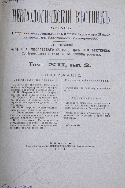 28 / VII. The patient died at 6.30 am. Opening 28 / VII. Great emaciation; stiffness is poorly expressed; on the sacrum and on the right trochanter — bedsores. The bones of the cranial vault are thickened, diplöe is almost absent. Dura mater is spliced ​​in some places with the inner surface of the vault and with the pia mater. The last one is thickened, cloudy (milky stripes), it is removed from the surface of the brain with great difficulty. Brain weight 1397.0; its substance is edematous; the cortical substance is anemic, atrophied; the lateral ventricles are dilated with a large amount of serous fluid. In the internal organs, except for the expansion of the lower lobes of both lungs, no pathological changes were noted.